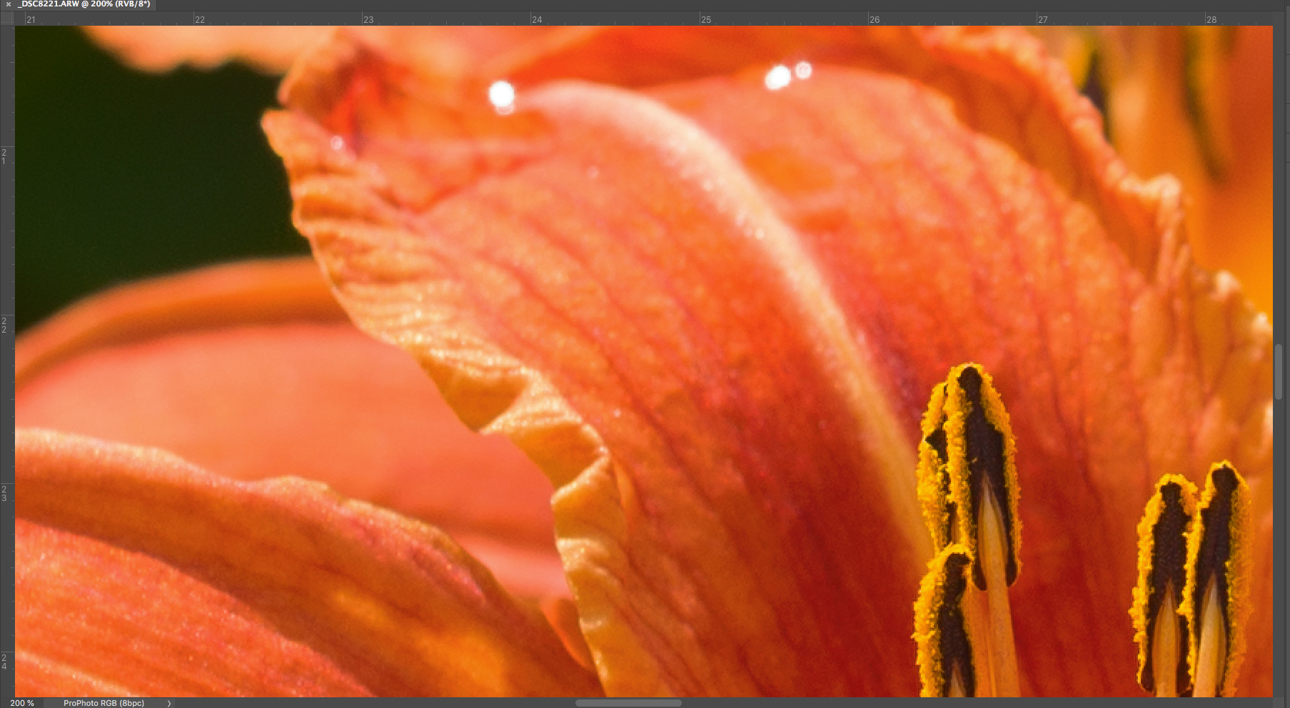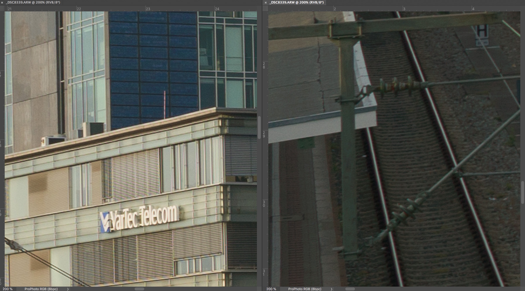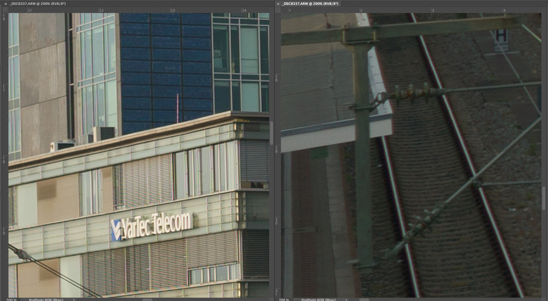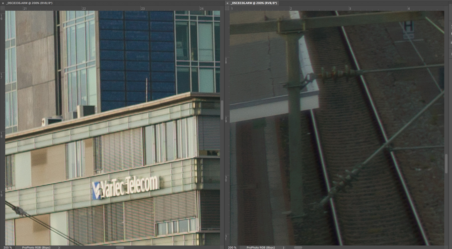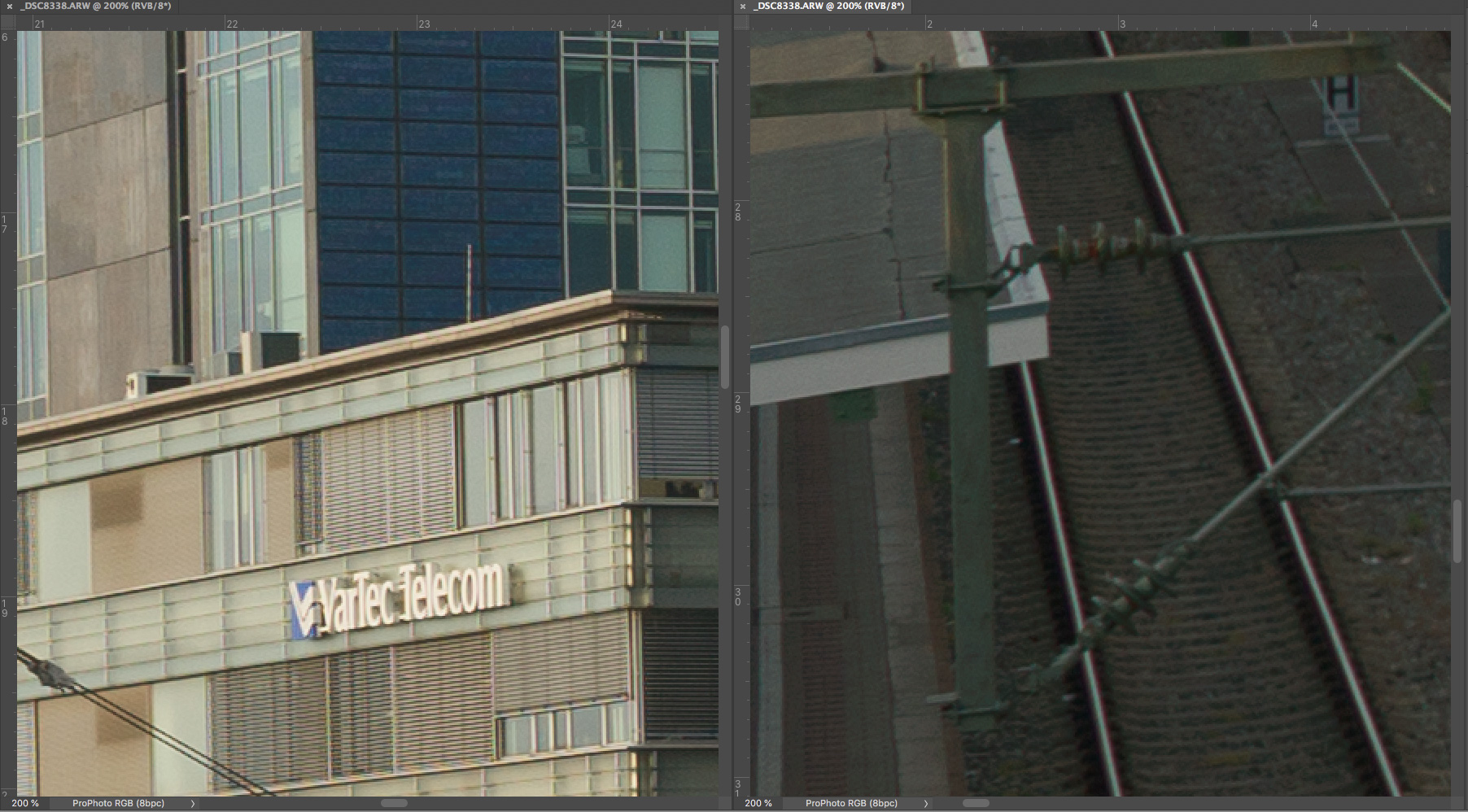 Die folgende Testserie wurde mit einer auf einer Mauerbrüstung aufgestützten Sony A7R bei ISO 200 fotografiert. Dabei habe ich darauf geachtet, dass die Belichtungszeit bei der mit kleinster Blende angefertigten Aufnahme immer noch über der zulässigen Verwacklungsgrenze bleibt um Unschärfen zu vermeiden. Vorher habe ich mit maximaler Lupenvergrösserung und offener Blende auf ein Detail in der Bildmitte scharfgestellt. Die Bilder wurden nur mit Standardeinstellung in Camera Raw geschärft, die lateralen und longitudinalen chromatischen Abberationen bleiben unkorrigiert. Letztere bleiben aber sehr moderat und in Camera Raw noch gut beherrschbar und verschwinden nach einer automatischen Korrektion fast vollständig. Bedenkt bitte, dass es sich hier um fast ungeschärfte Ausschnitte in 200% - Vergrösserung handelt und man ansonsten eine Fotografie nur ganz selten in einem so grossen Massstab reproduzieren würde.