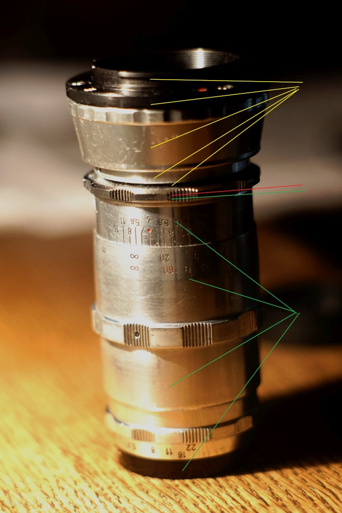 gelb = EM / Lordomat Adapter mit m39 Gewinde (unterster gelber Strich) und Kerbe, Arretier-Stift befindet sich am Objektiv