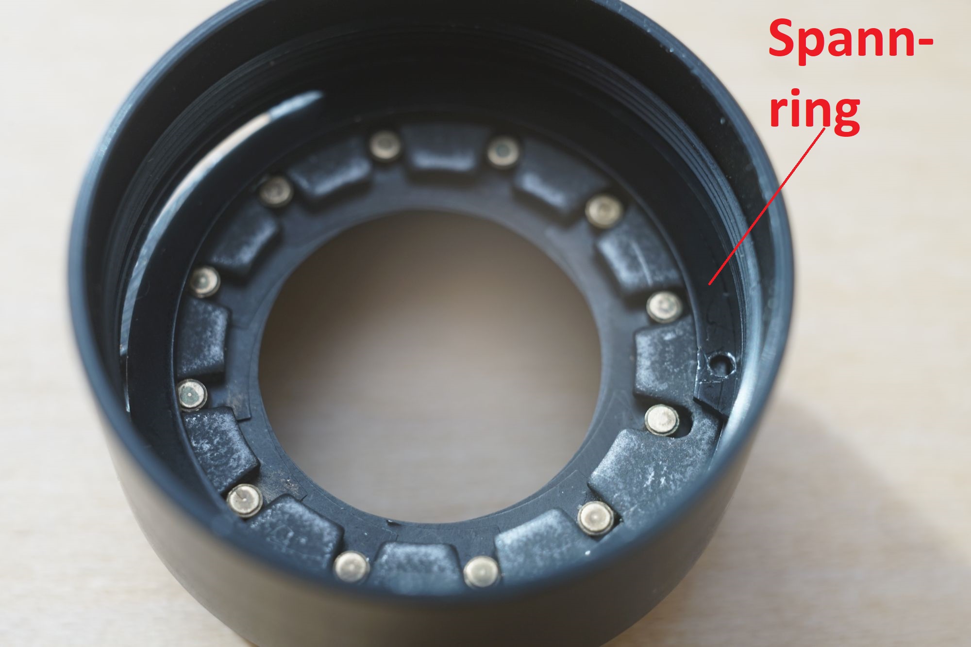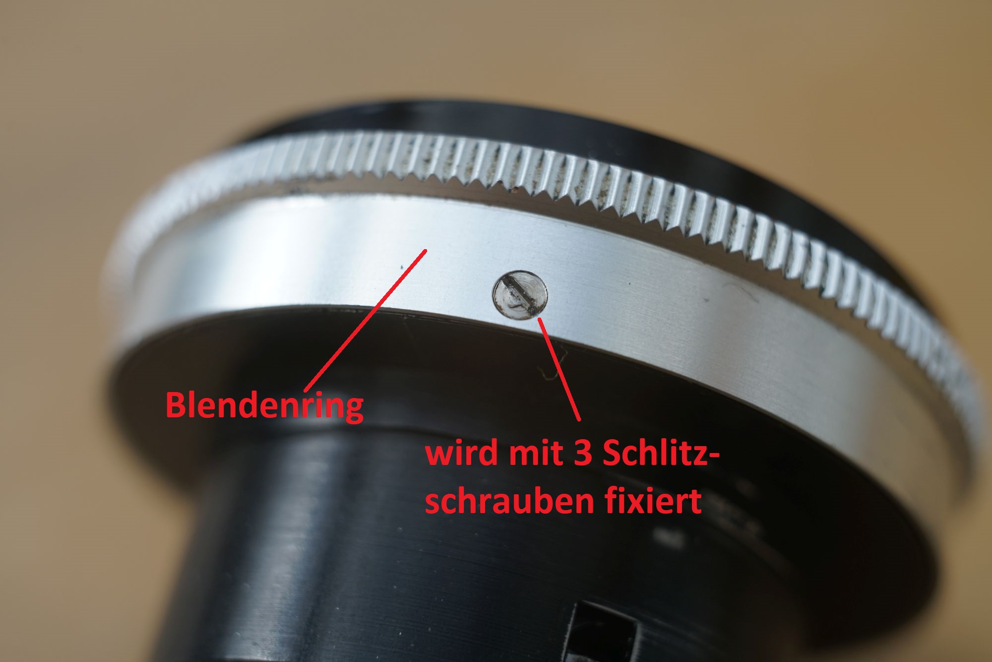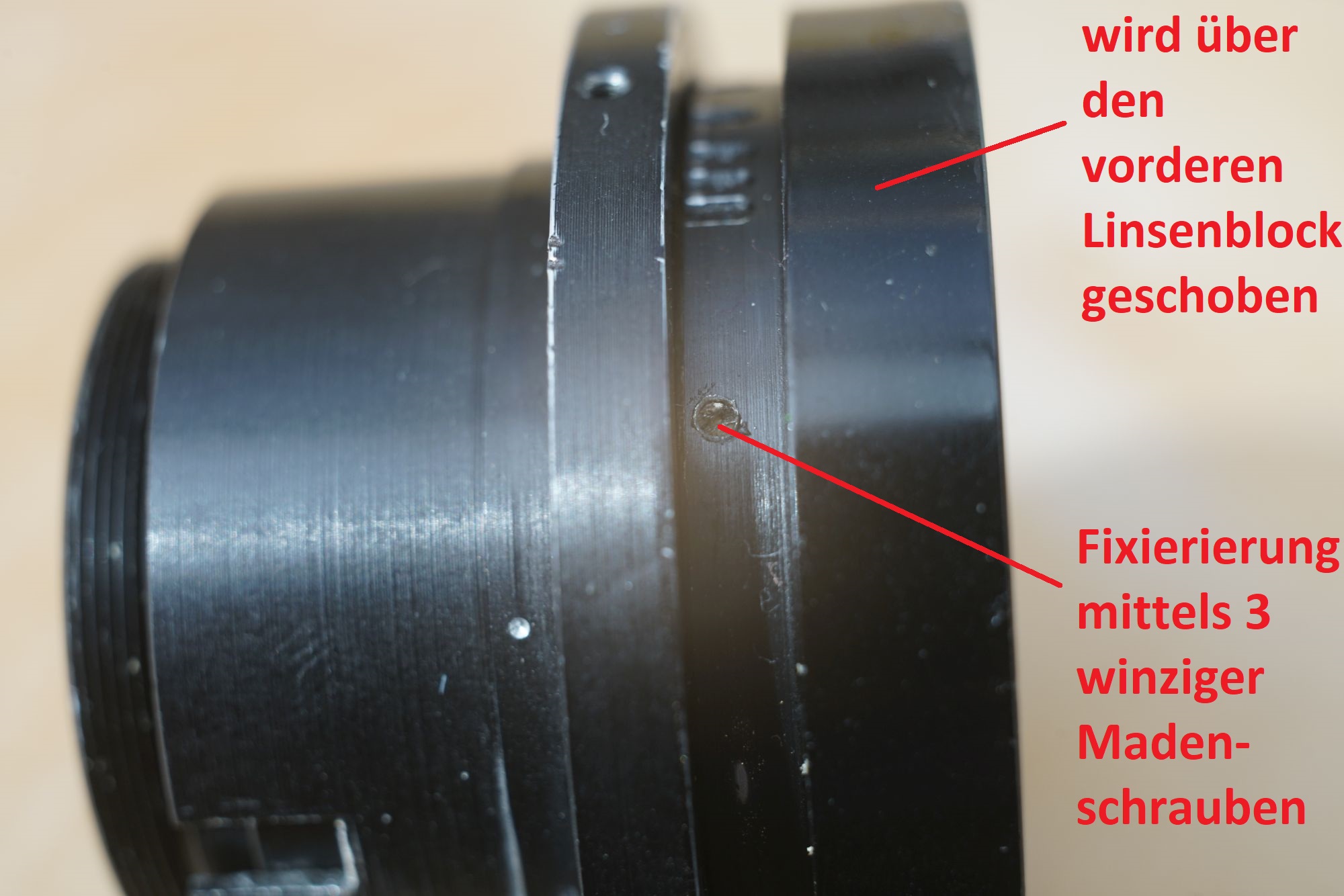 Der Filterring samt Blendenrastungen ist mit 3 winzig kleinen Madenschrauben am vorderen Optikblock befestigt.