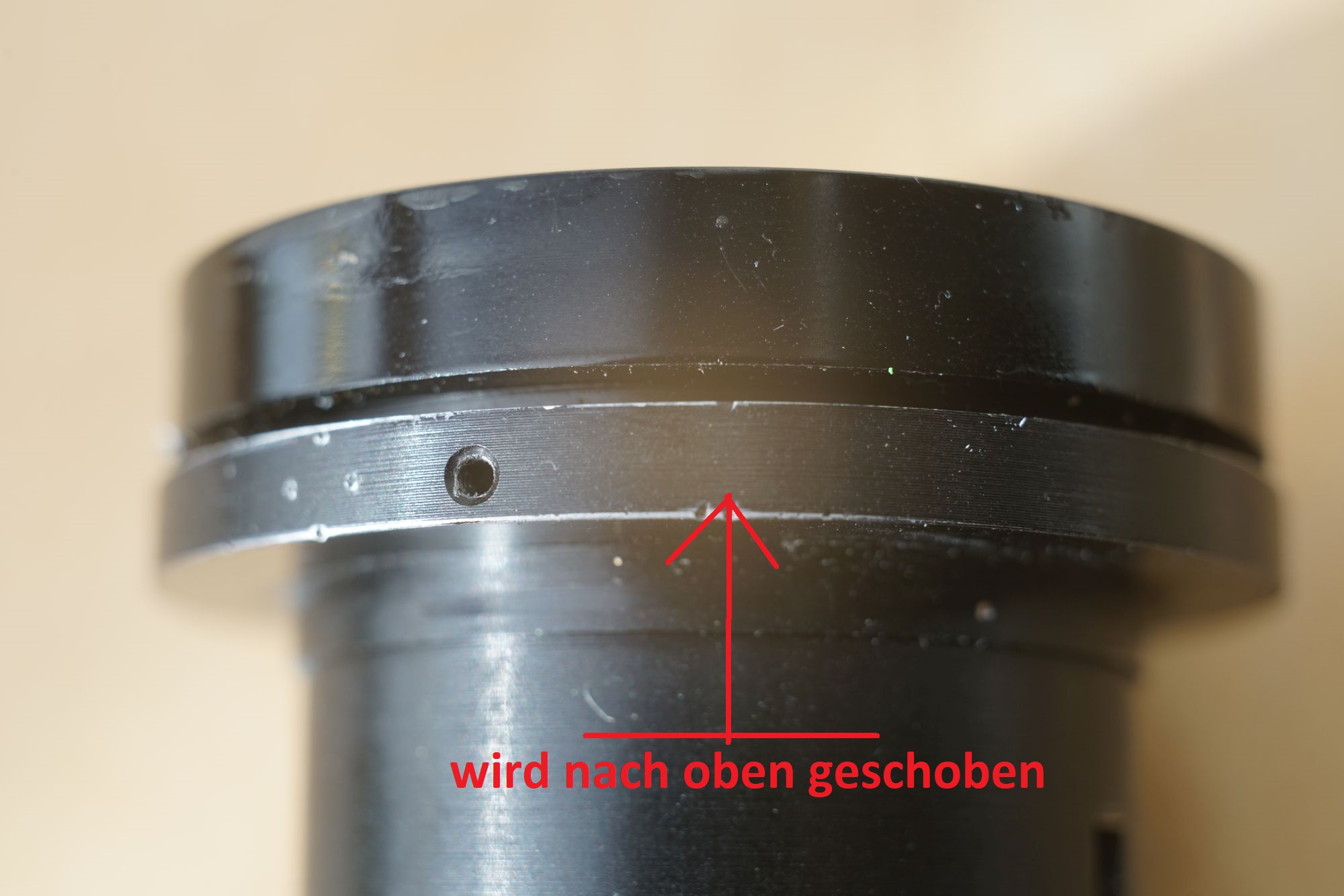 so, dass der untere Ring in einen kleinen Zapfen flutscht und der obere Ring mit dem Blendenmitnehmer