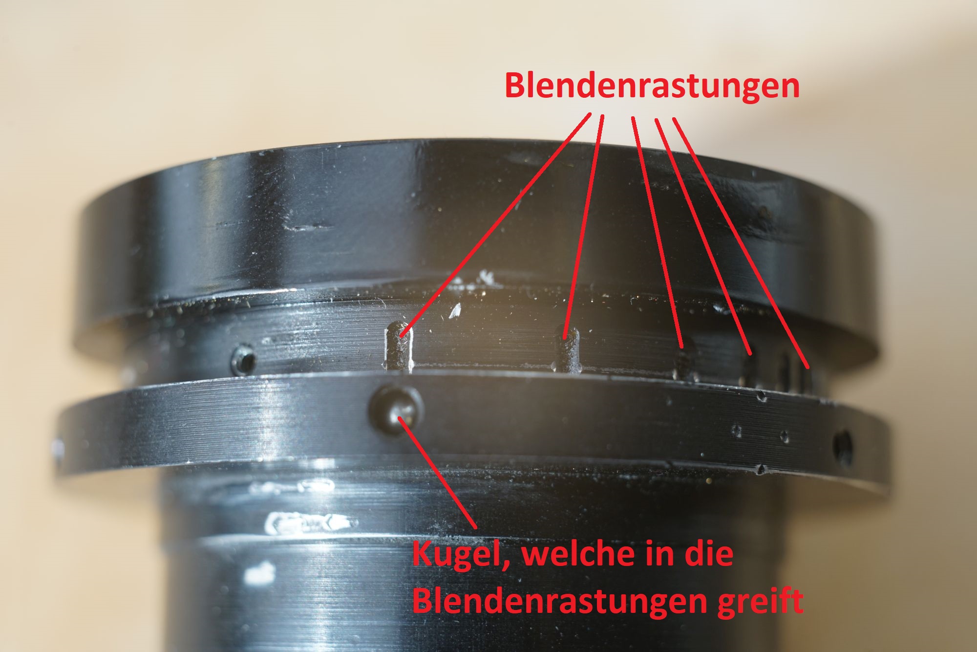 Hier sieht man gut die Kugel, welche in die Blendenrastungen eingreift. Über der Kugel sitzt eine kleine Stahl-