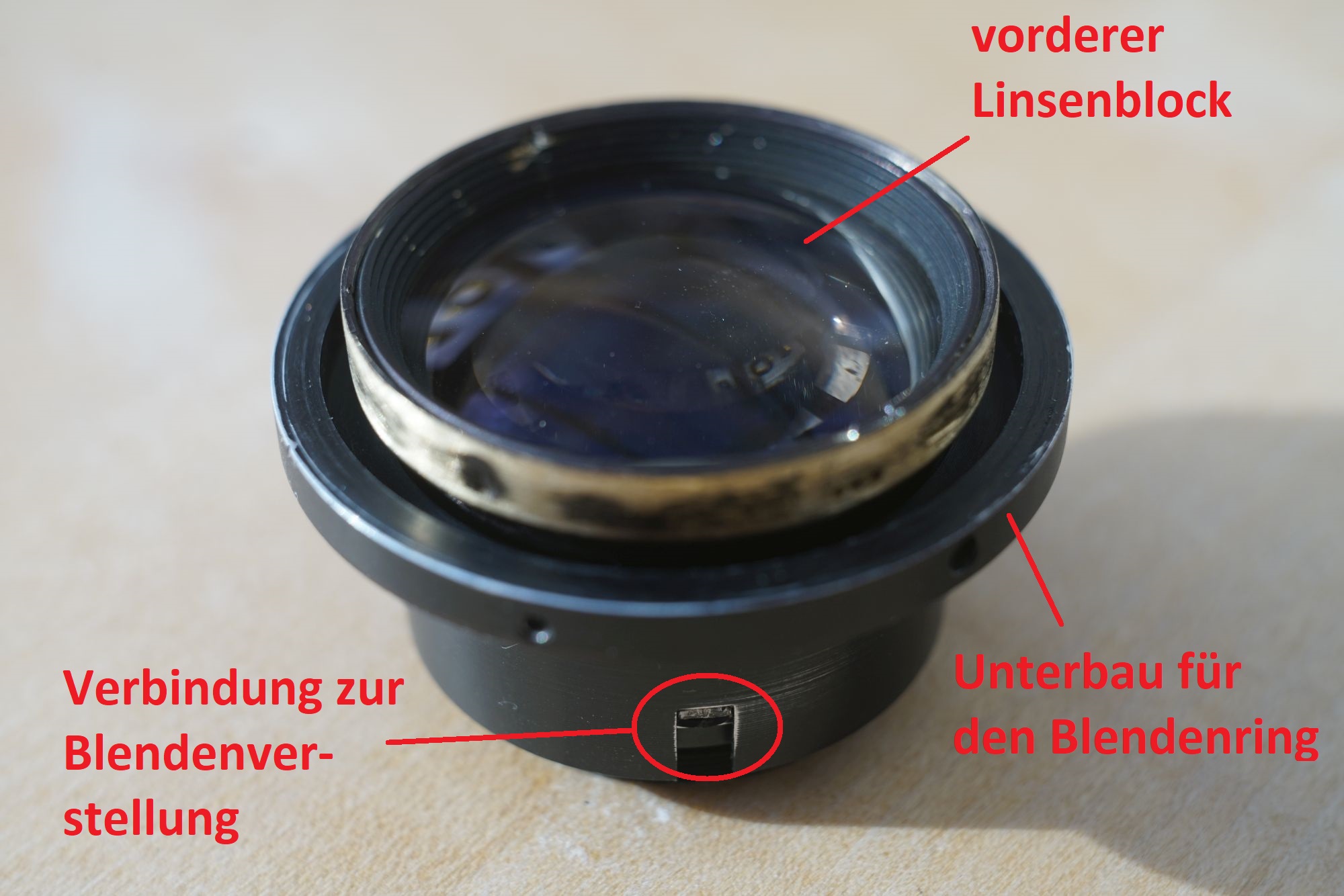 Hier sitzt der Linsenblock noch fest verbunden vor der Blende. Er ist nicht gesichert und müßte "nur" herausge-