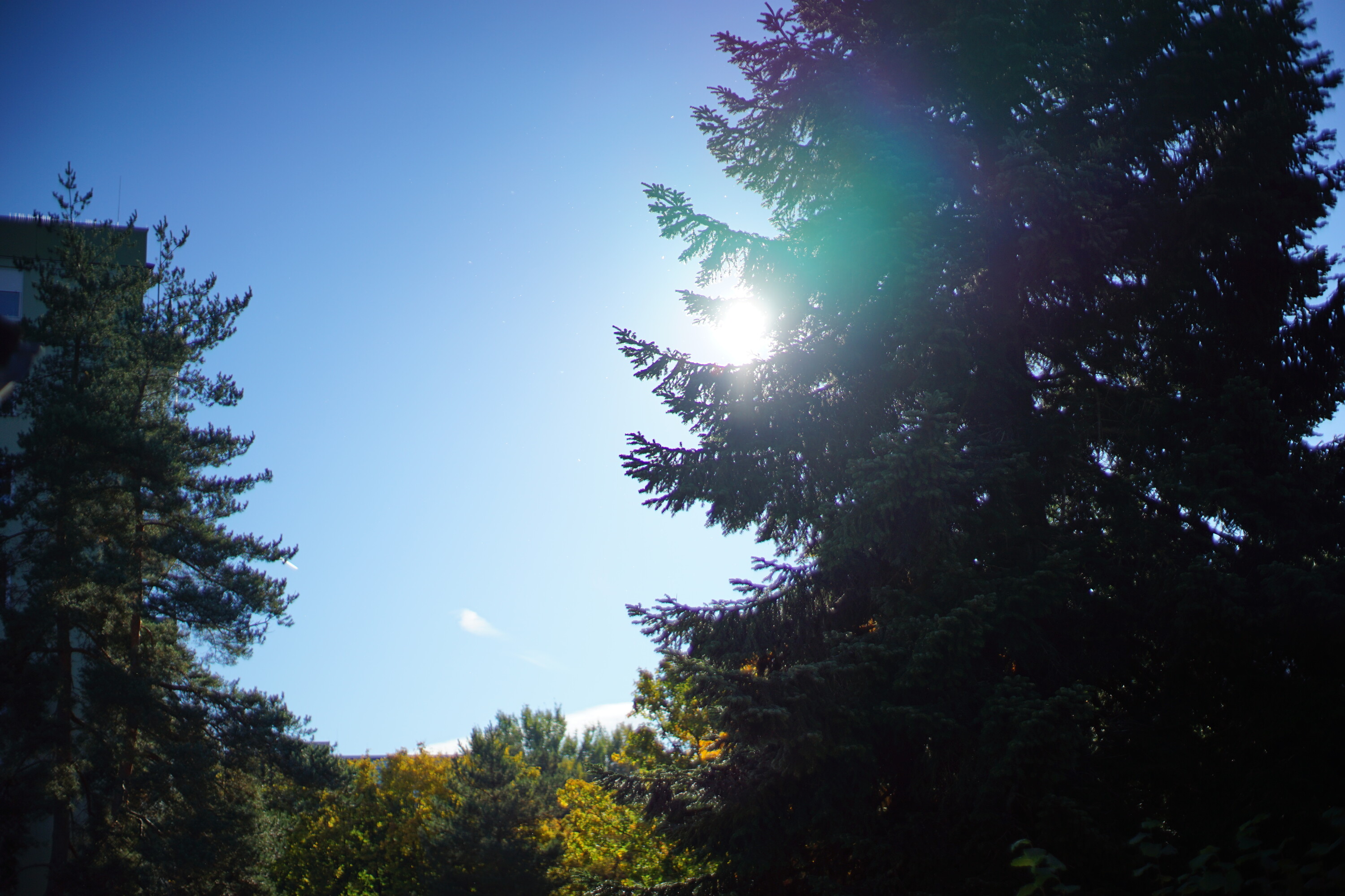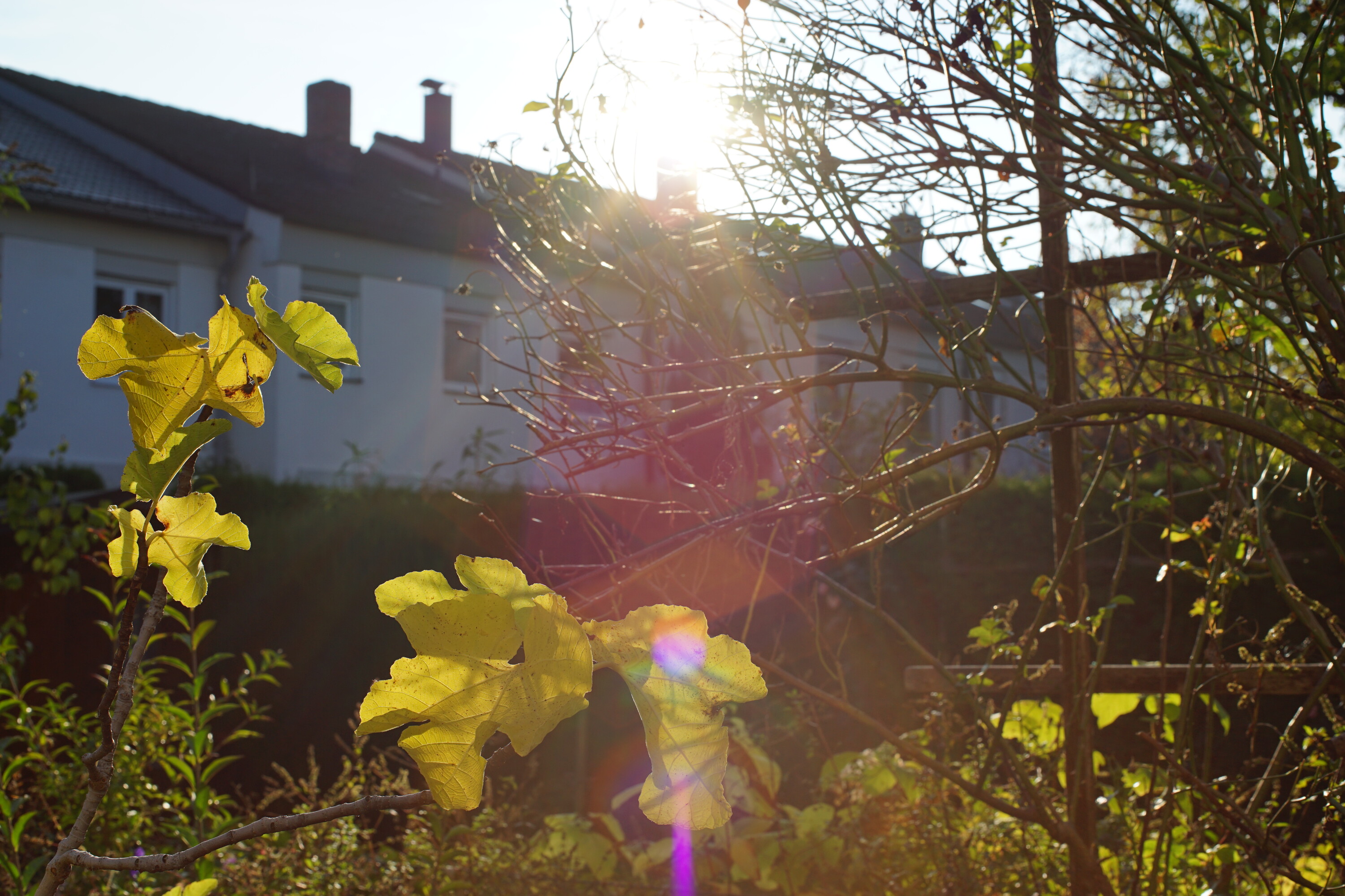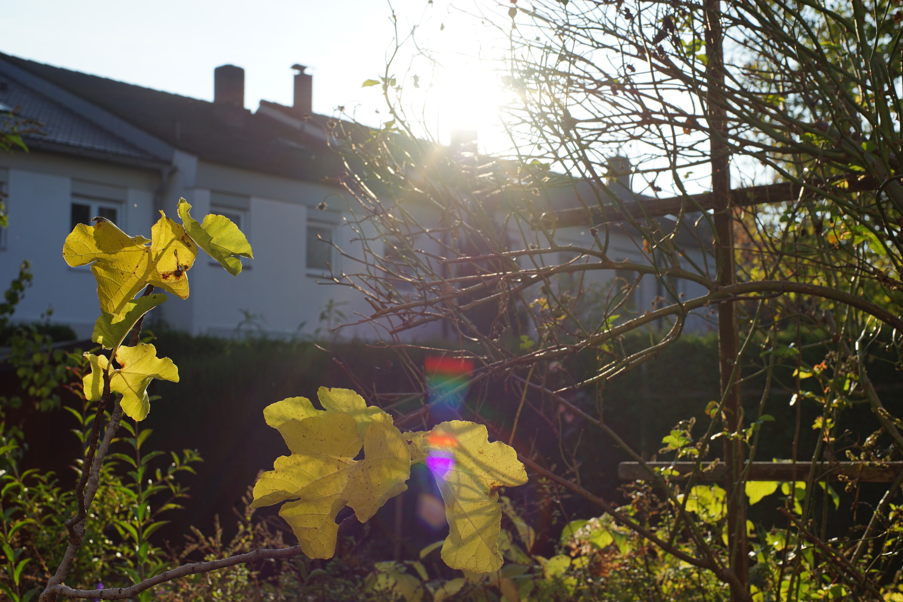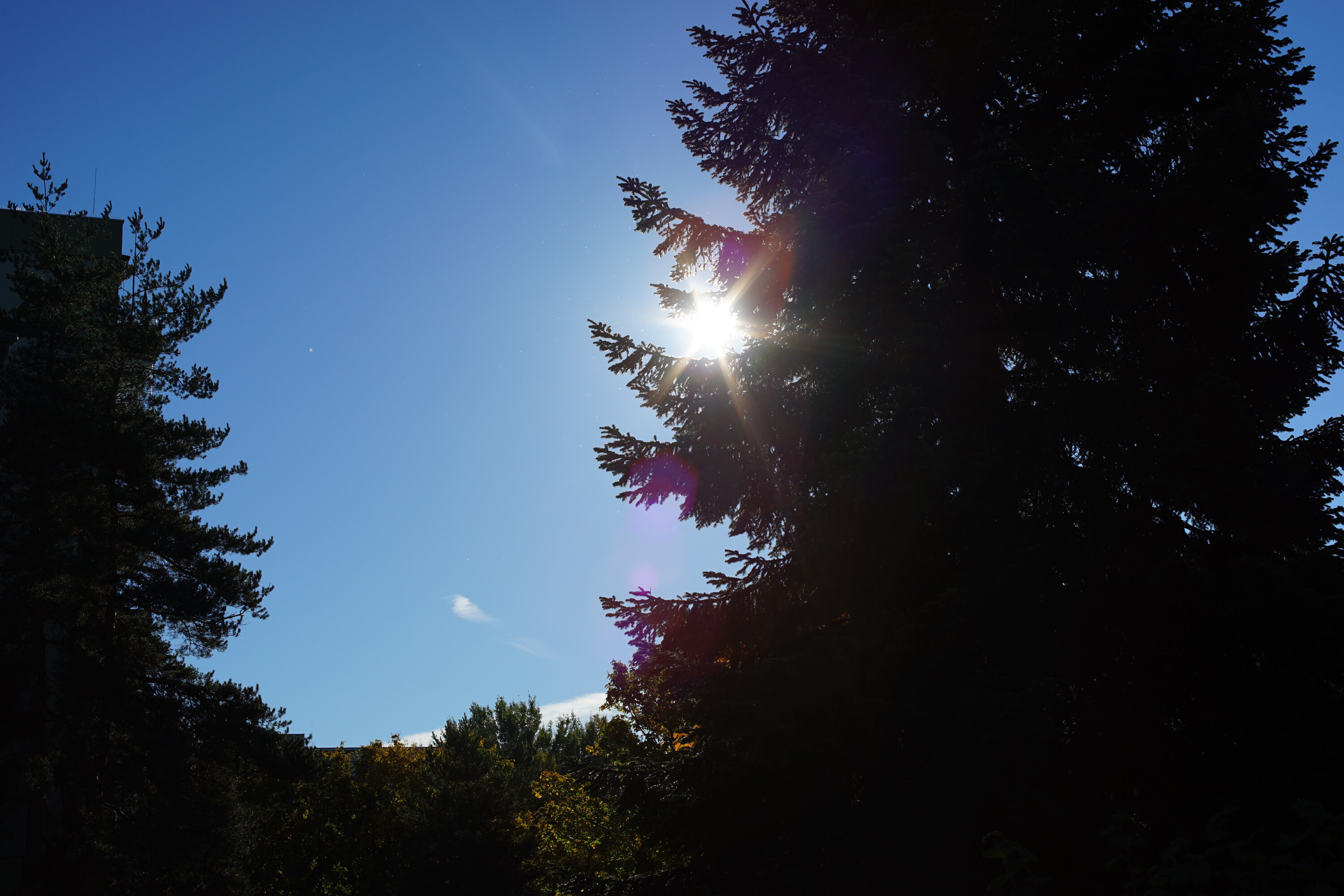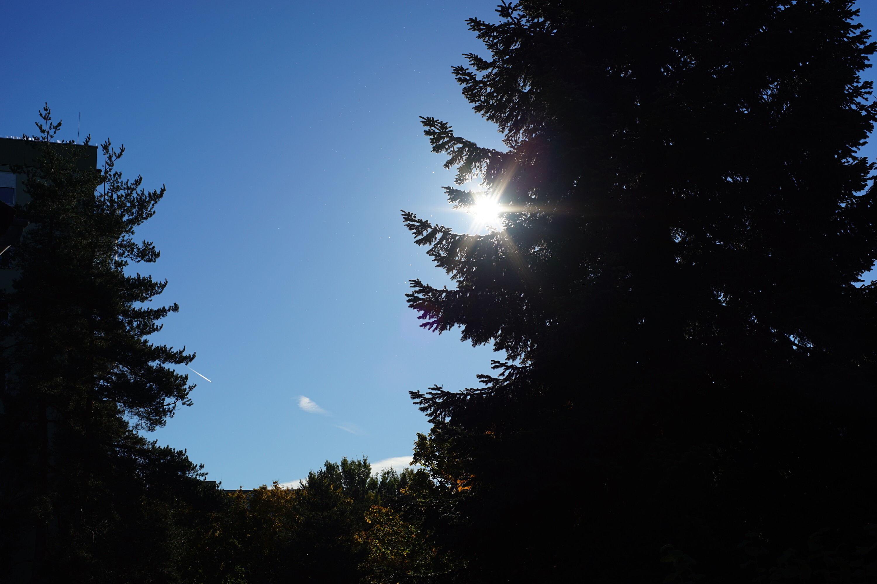 Zuerst ein Bild mit hinter Ästen abgeschatteter Sonne, einmal offen, einmal auf f11, auf der Suche nach dem Blendenstern.