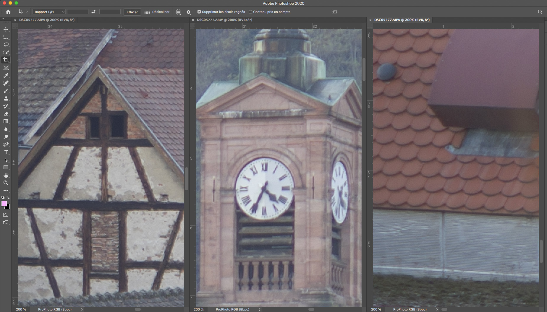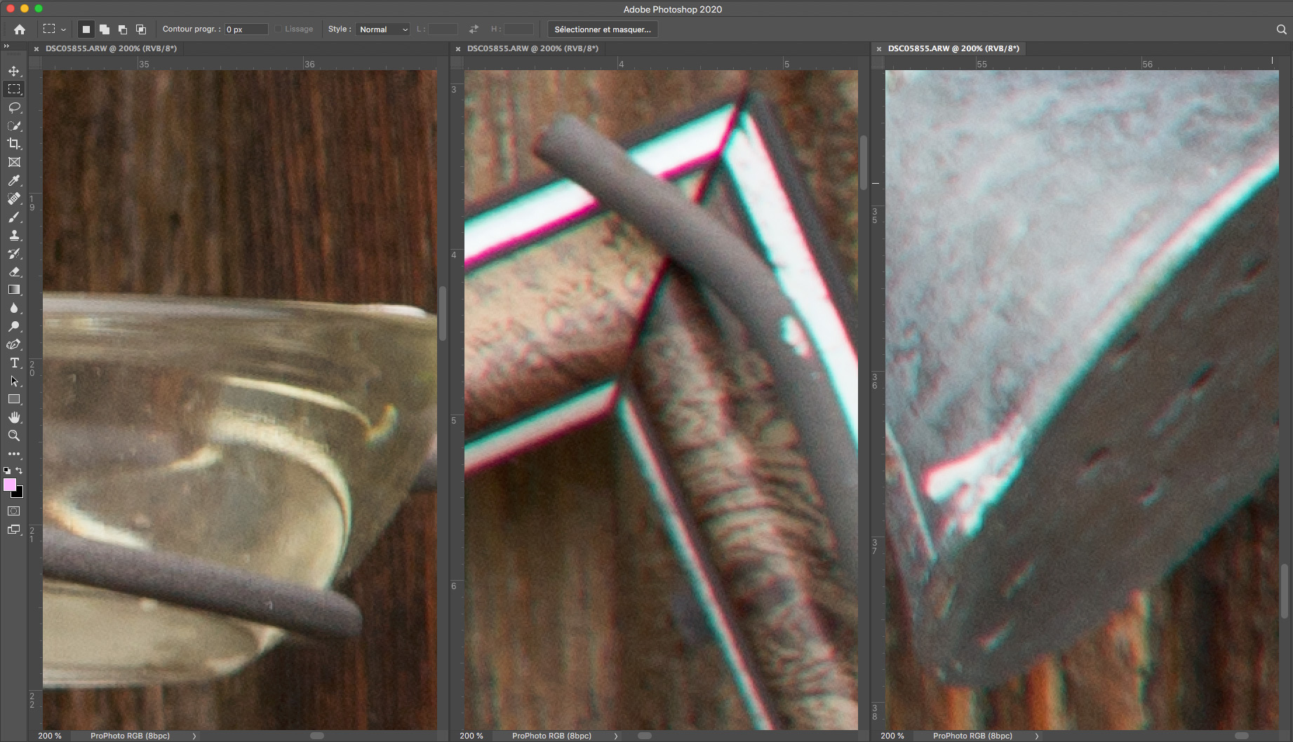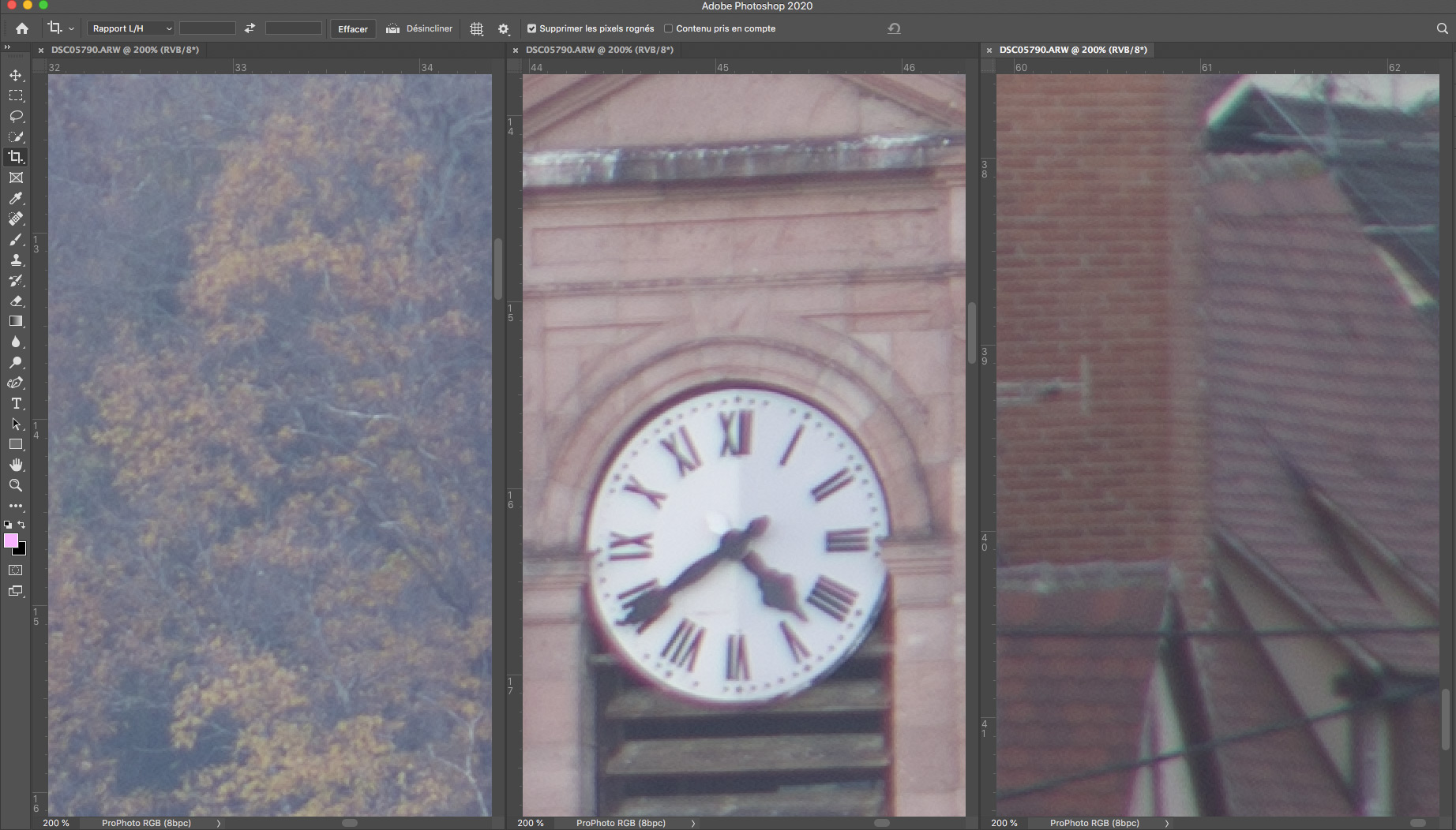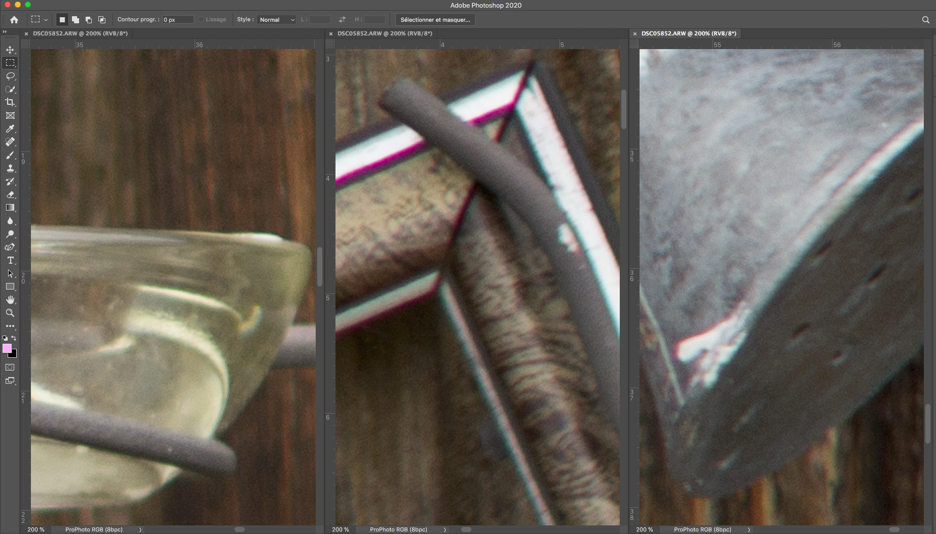 Ausschnitte (200%) : Mitte (links), erweitertes Zentrum (Mitte) und Ecke rechts oben (rechts)