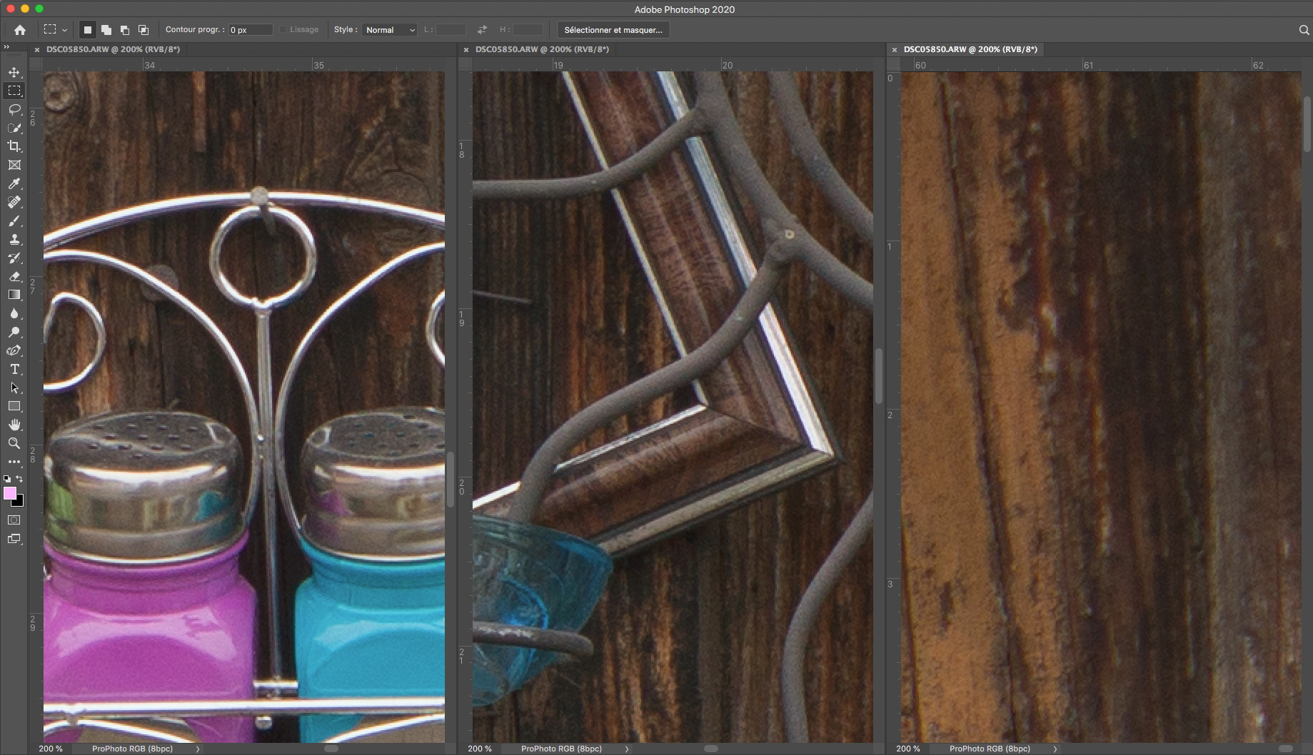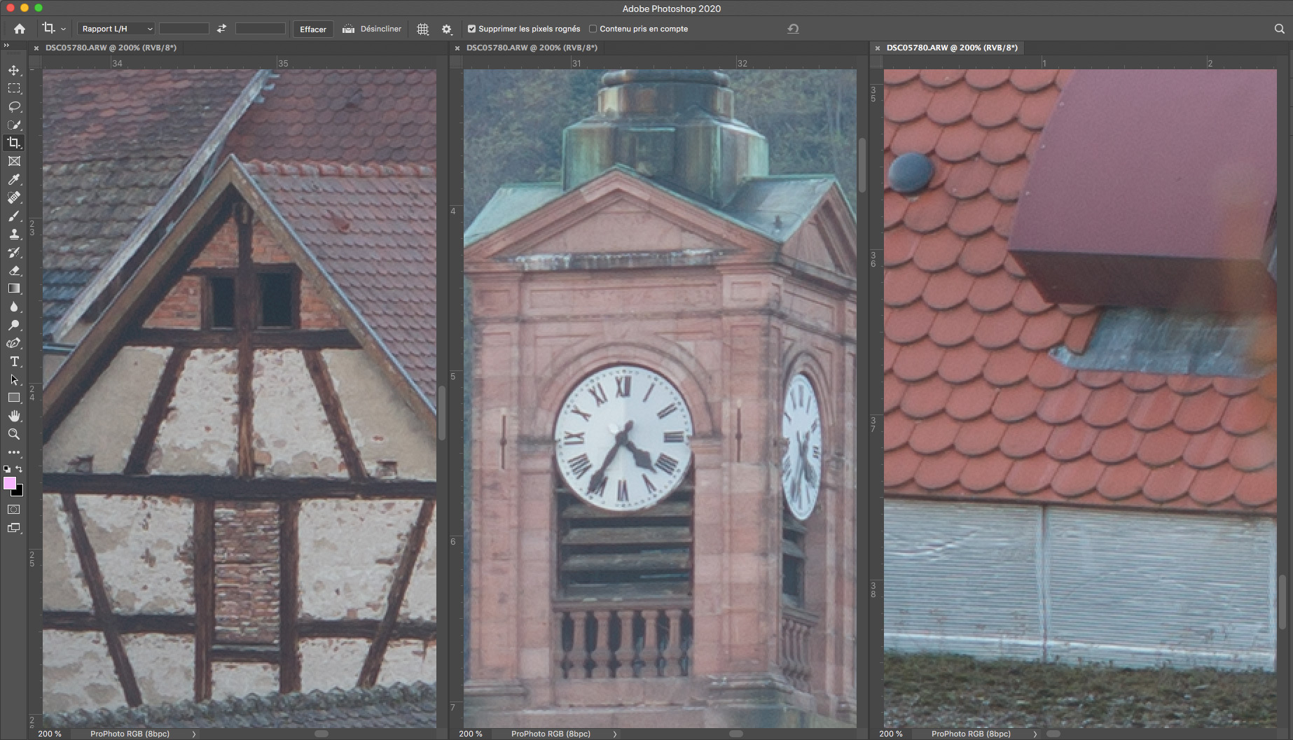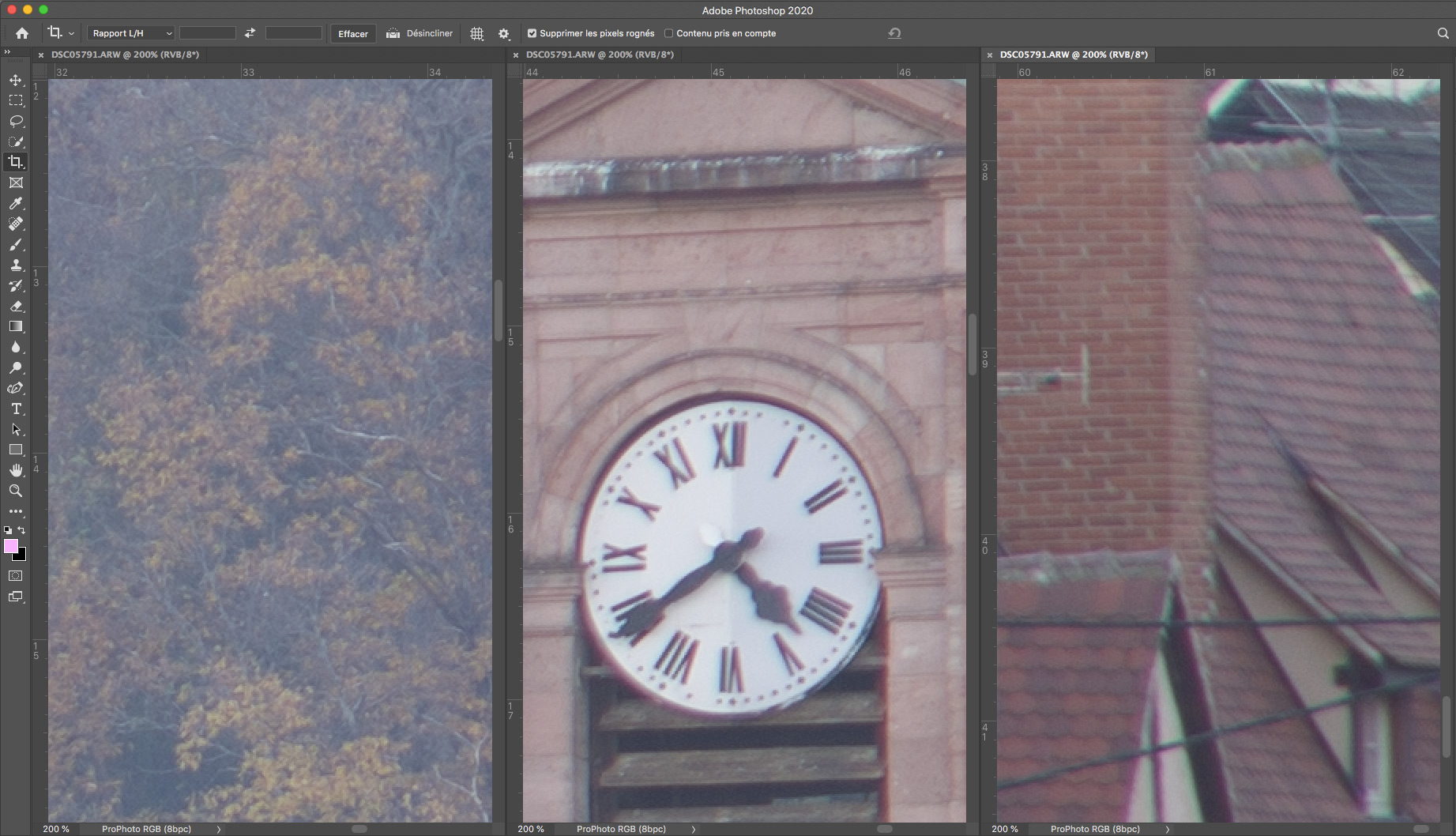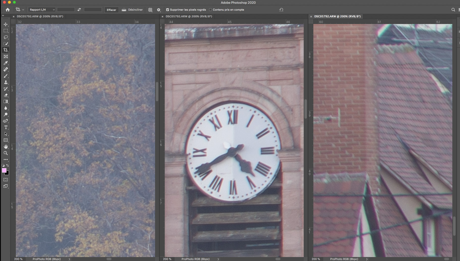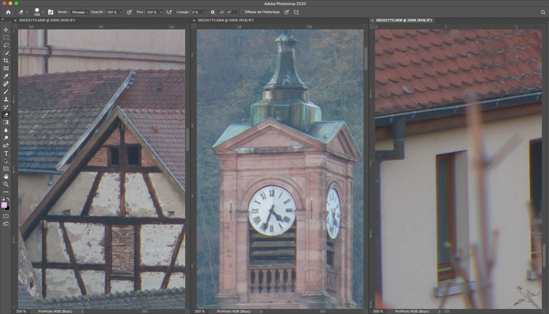 Ausschnitte (200%) : Mitte (links), erweitertes Zentrum (Mitte) und Ecke rechts oben (rechts)