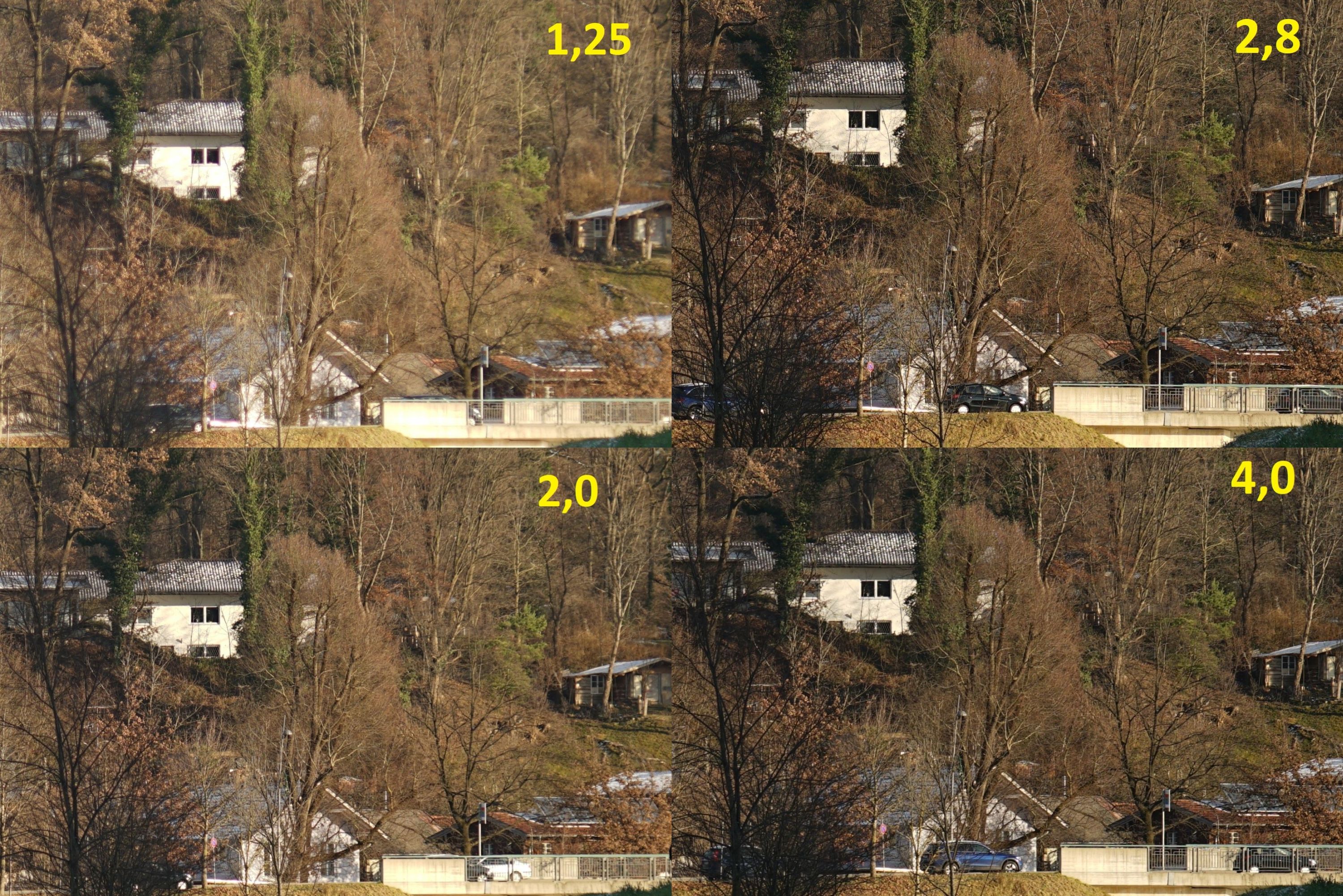 Fazit: weiter entfernte Objekte werden gut und detailreich wiedergegeben. Blende 1,25 ist brauchbar, ab f/2,8