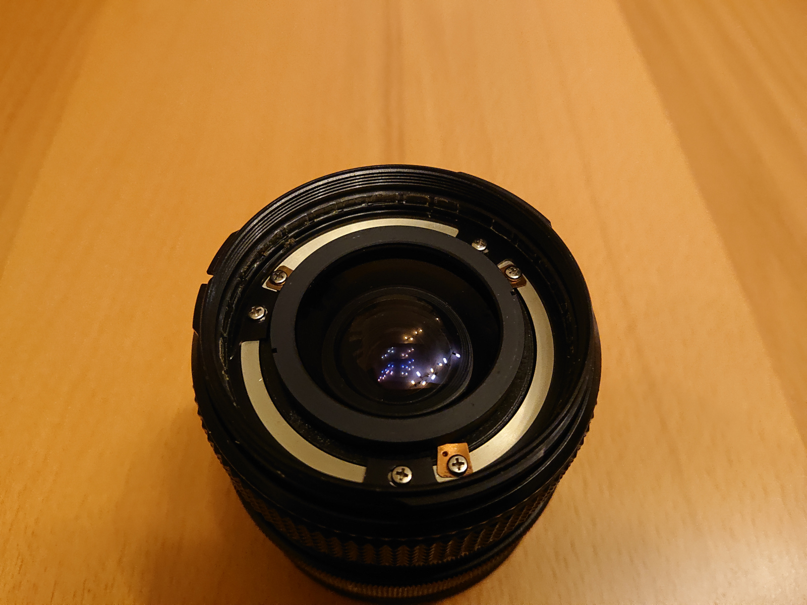 Die drei Linsen hinten sind nur mit einer Mutter festgeschraubt. Man kann die theoretisch einfach abschrauben, ohne das Objektiv auseinander zu bauen. Es ist jedoch besser das hintere Teil zu entfernen, damit man an die Stelle ran kommt, wo das ganze mit Lack fixiert ist.