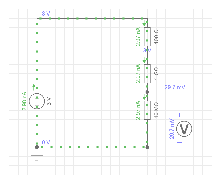 Das ergibt einen Spannungsteiler mit drei Widerständen. Und da ist es so, dass am größten Widerstand die meiste Spannung abfällt. Das ist die Oxydschicht mit 1 Gigaohm. Da geht fast die ganze Batteriespannung hin. Für das Multimeter bleibt dann nur ein Spannungsabfall von 29,7 Millivolt - und den zeigt es an.