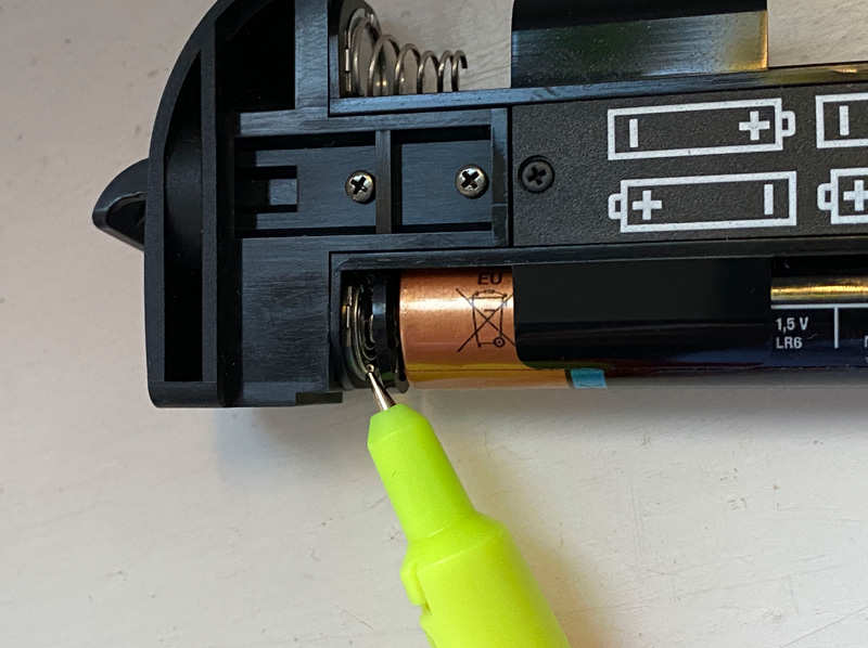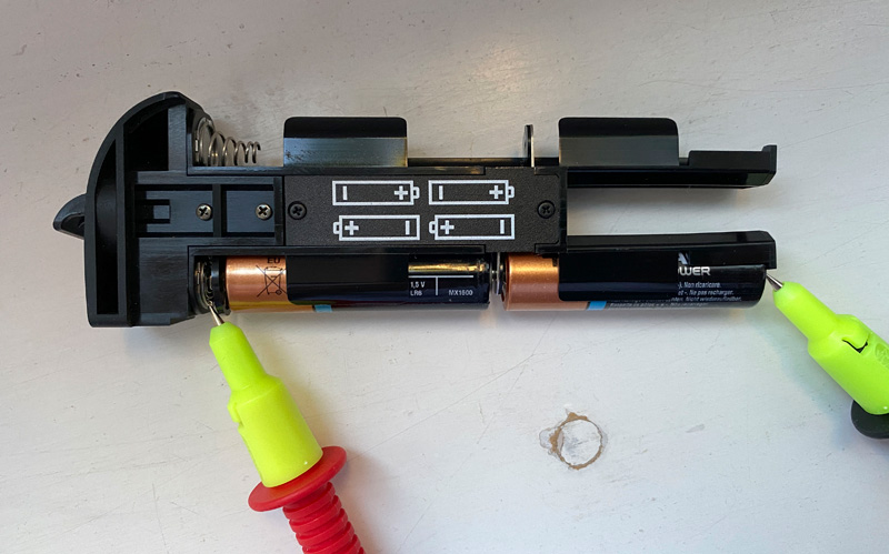 Die Messspitzen meines Multimeters hielt ich an den Kontakt des Batteriehalters (Pluspol) und an den Minuspol der zweiten Batterie.