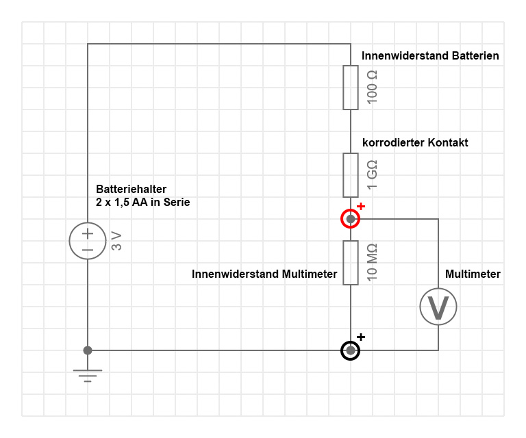 Der Strom fließt durch den Innenwiderstand der Batterie (hier als Ersatzwiderstand mit 100 Ohm eingesetzt), dann durch die Oxydschicht des Kontaktes und durch das Multimeter. Also eine Reihenschaltung mit drei Widerständen (Verbrauchern).