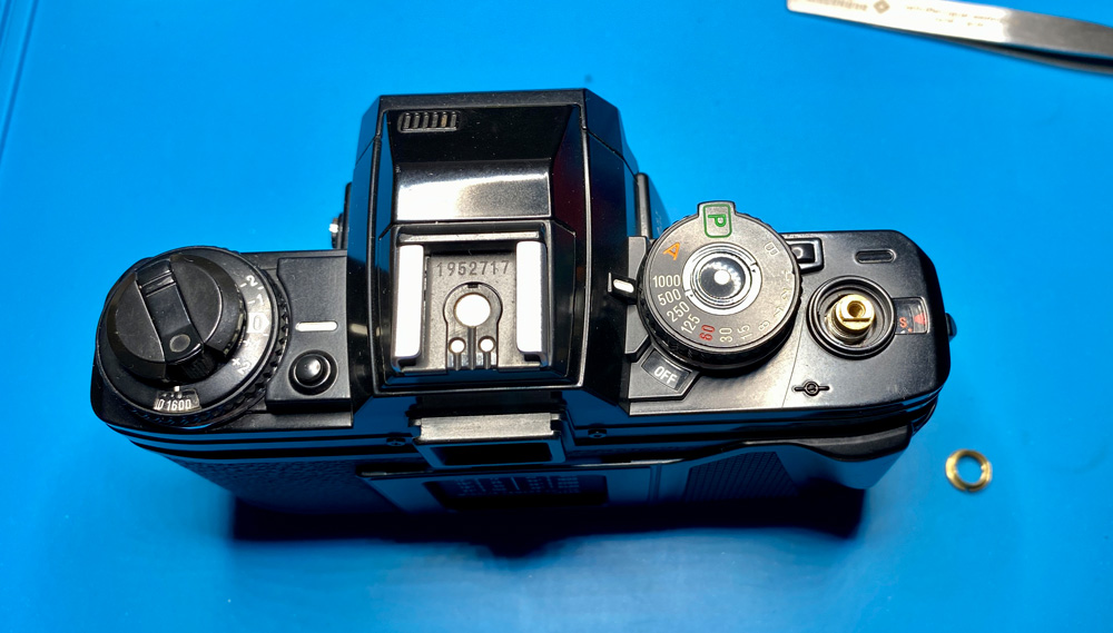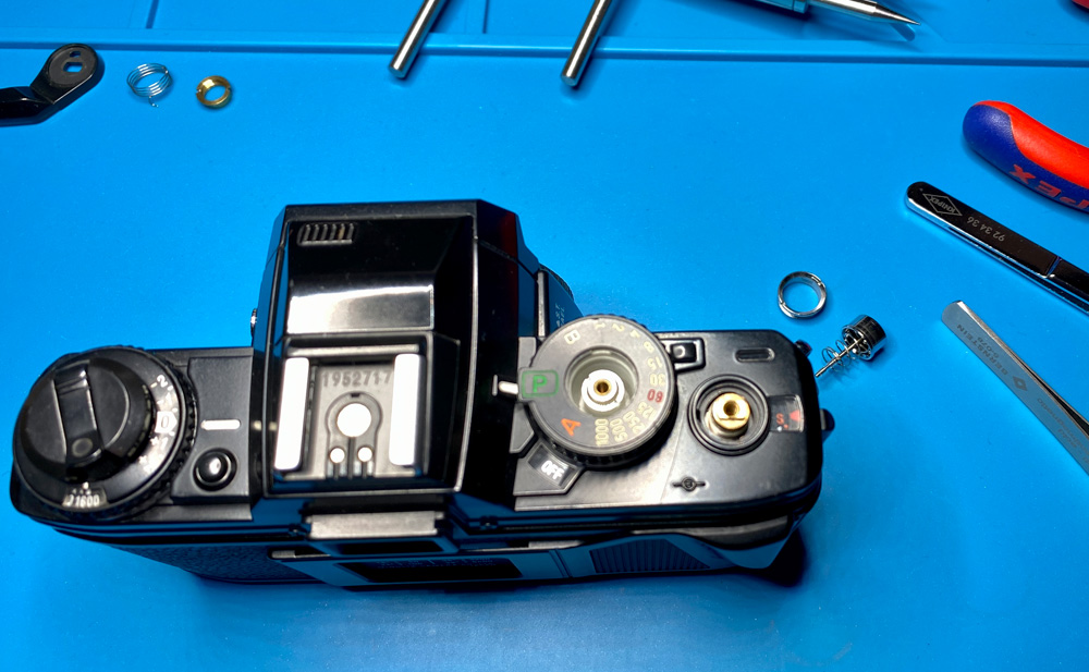 Das Verschlusszeitenrad ist schon aufgesetzt. Der Auslöseknopf auf Feder wird eingebracht ...