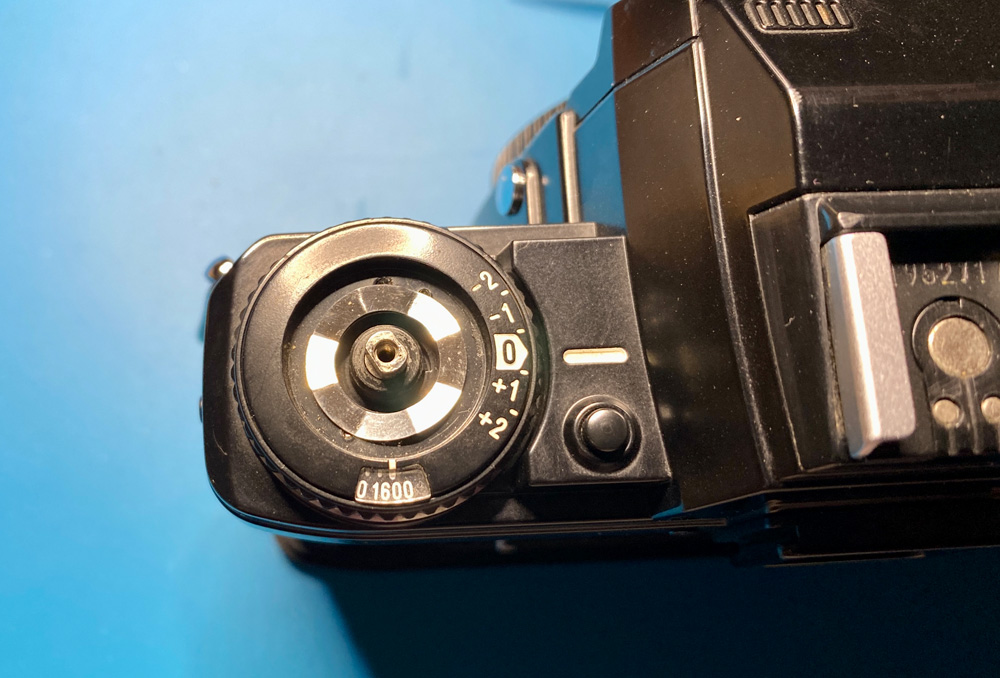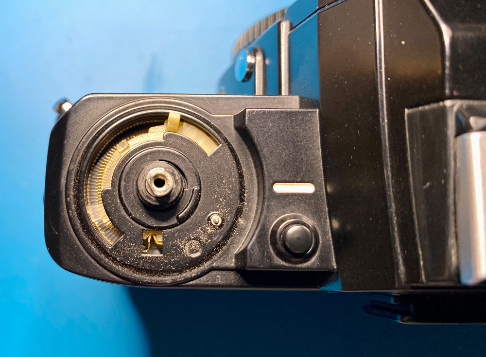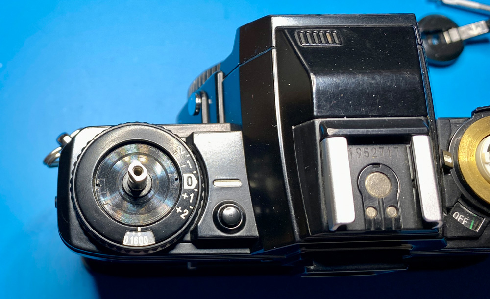 Der Bereich um Verschlusszeitenrad, Ein-/Ausschalter und Bildzählwerk