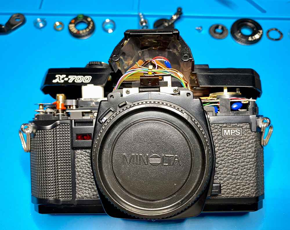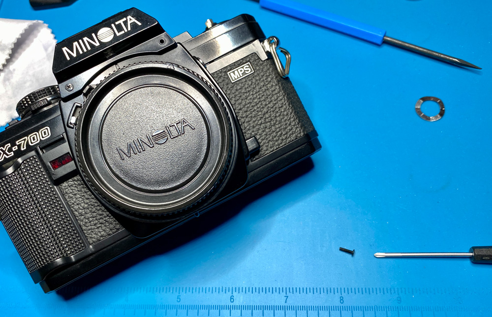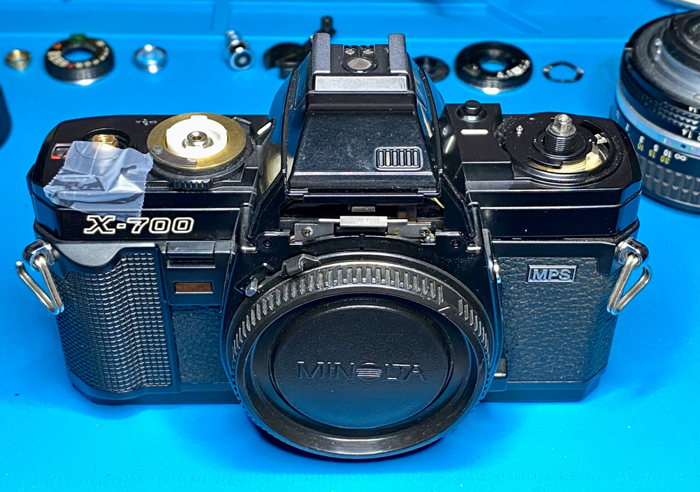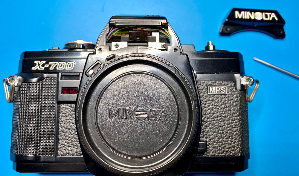 Alle notwendigen Schritte sind in diesem Video - Fix Old Cameras: Minolta X-700 Top Cover Removal - zu sehen