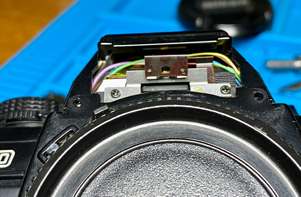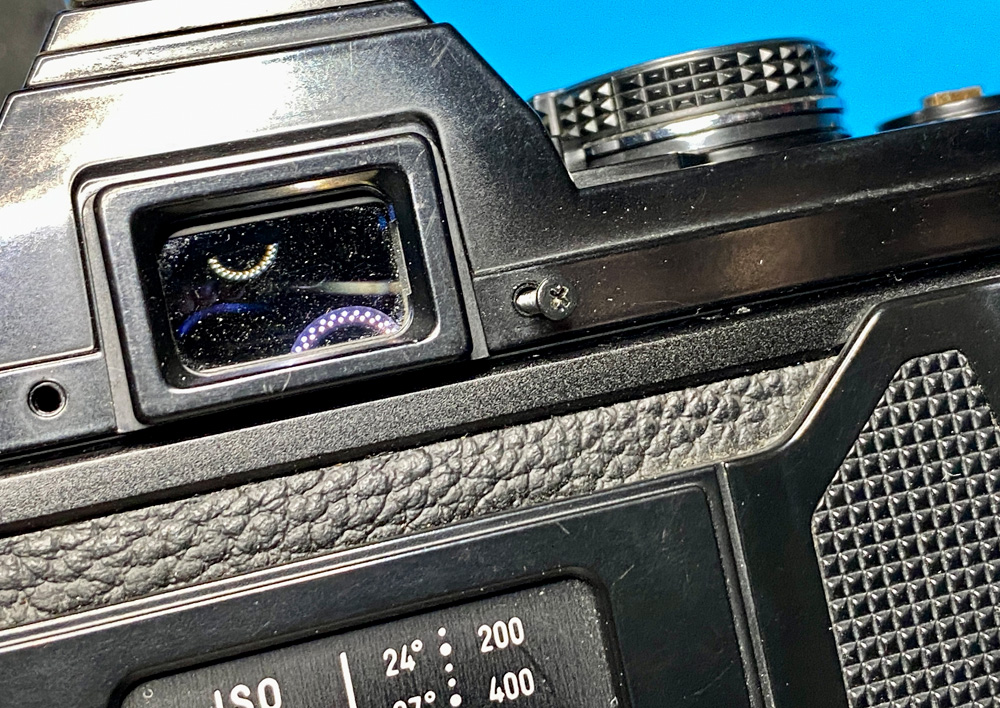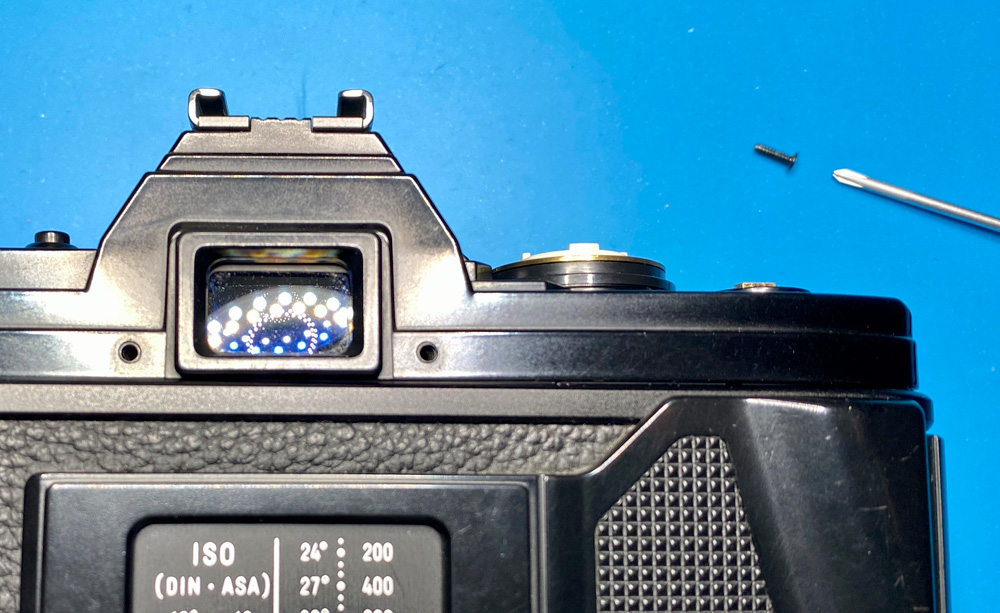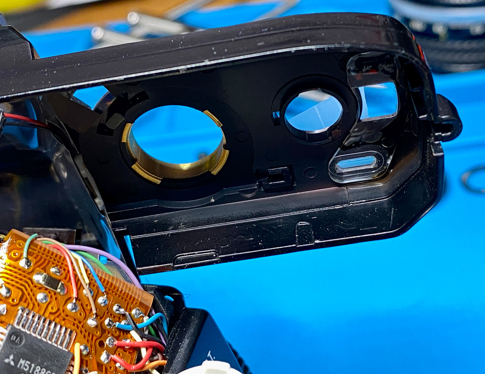 Die Rückseite der vorderen Abdeckung. Zu sehen ist in der Mitte die kleine Linse, die die Werte auf dem Blendenring in den Sucher einbelichtet.