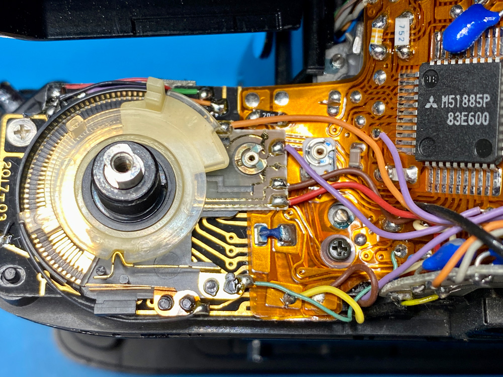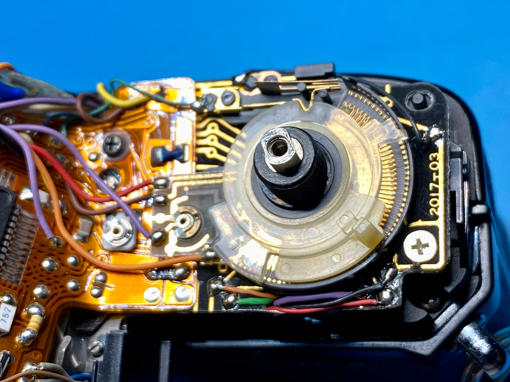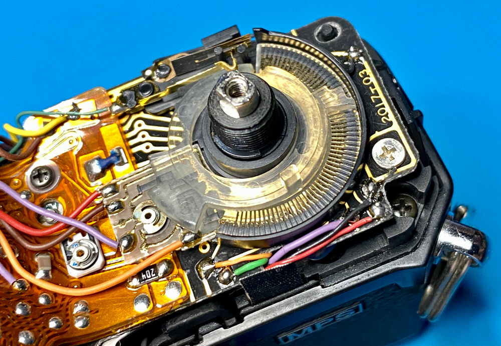 Der Bereich um Override und ASA-Einstellung. Schleifer und Kontakte sind für beste Leitereigenschaften vergoldet.