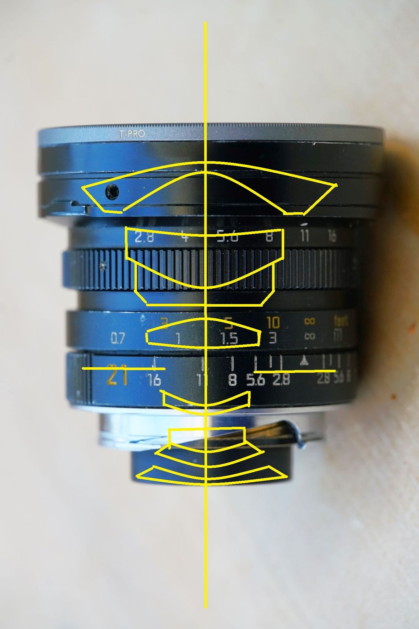 es besteht aus 8 Linsen in 6 Gruppen (ohne Sondergläser, Asphären und floating elements),