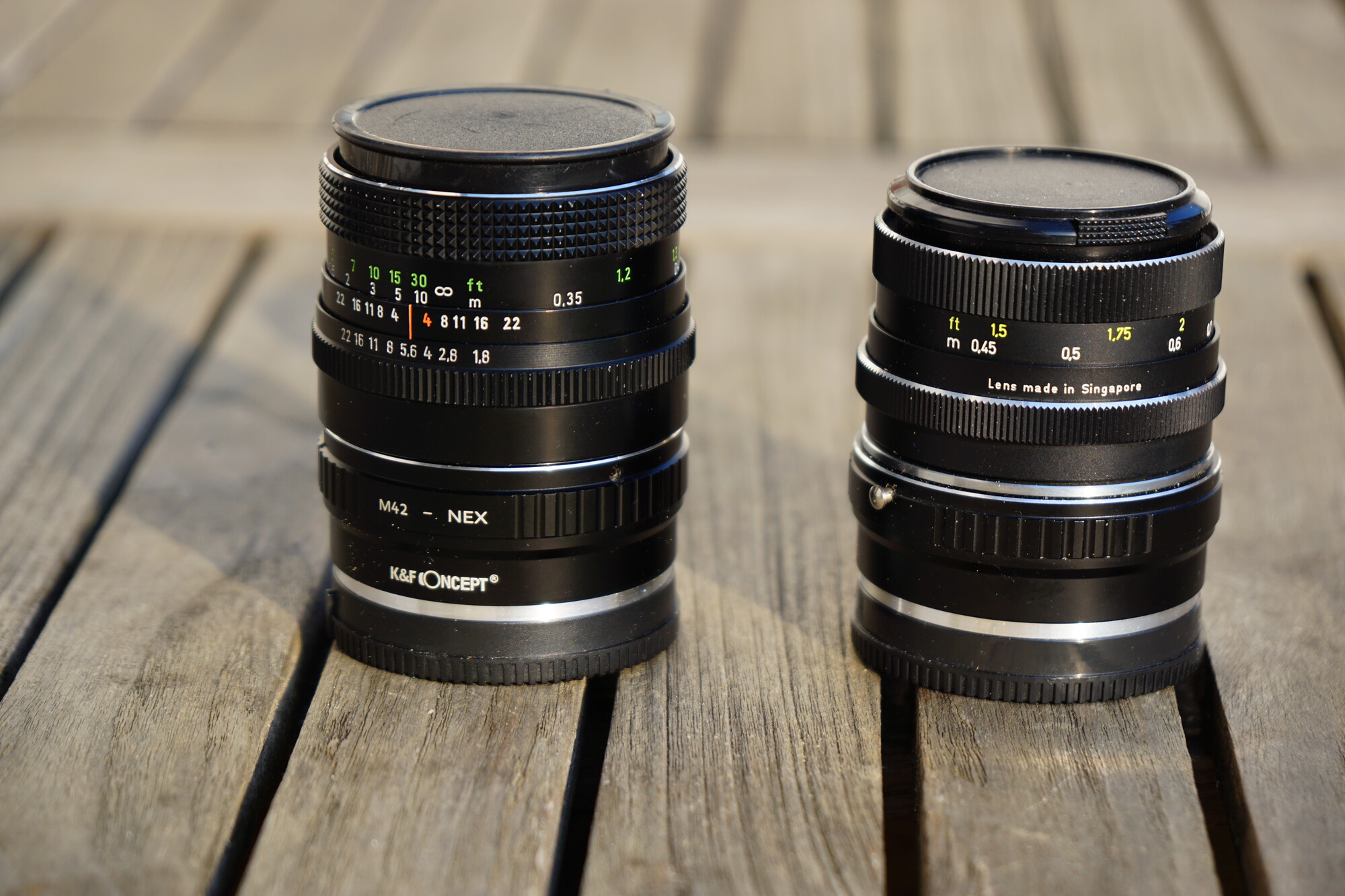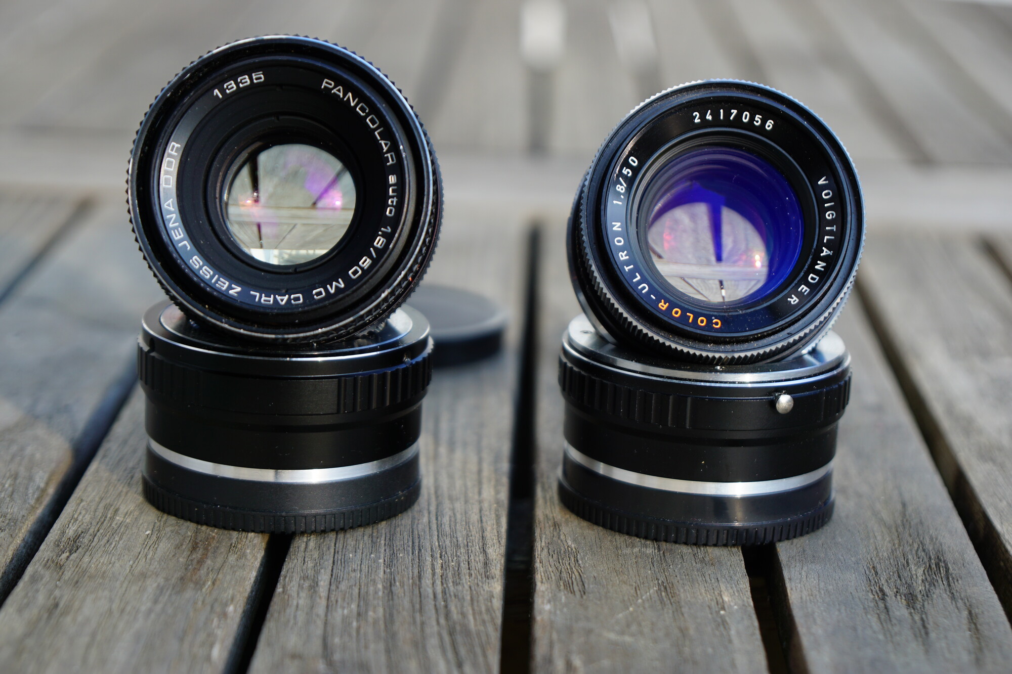 Das Voigtländer Color Ultron 1.8/50mm war mein allererstes Altglas, ich habe es 2017 sehr günstig im Netz bekommen, es sieht aus wie neu und fühlt sich auch so an. Das Pancolar habe ich von Peter hier im Forum bekommen, es ist auch in gutem Zustand, aber der Fokusring läuft unregelmäßig, bei schnellem Drehen ist der Widerstand plötzlich weg und es fühlt sich an, als ob etwas aus dem Lager gleitet.
