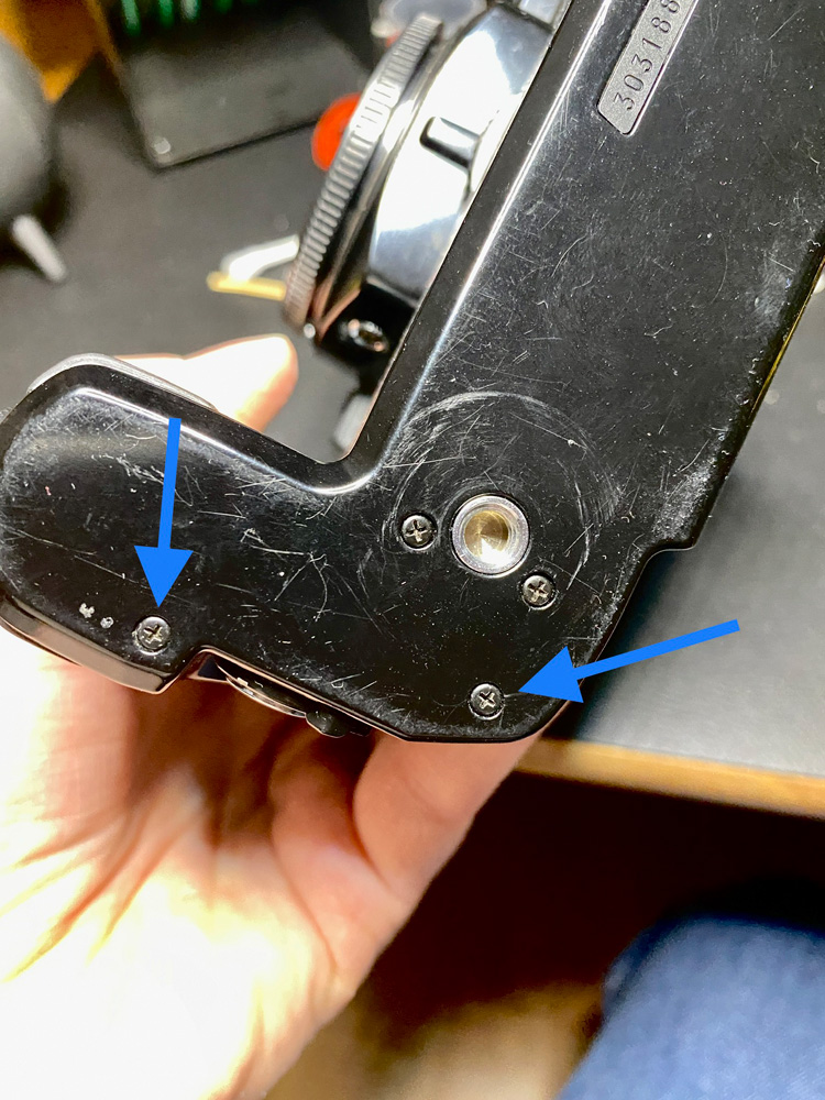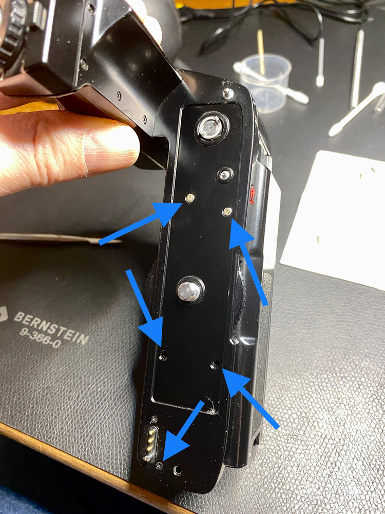 Unter der Gummimatte am Oberteil des Motor Drive sitzen die weiteren Schrauben, die gelöst werden müssen.