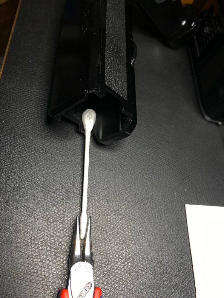 Ein Wattestäbchen mit Elektronikreiniger an der Zange kam gut an die beiden Kontakte im Batterieschacht heran: