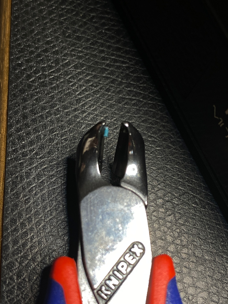 Das blaue Kabel wird mit dem Seitenschneider abisoliert, um den Draht zum Löten freizulegen:
