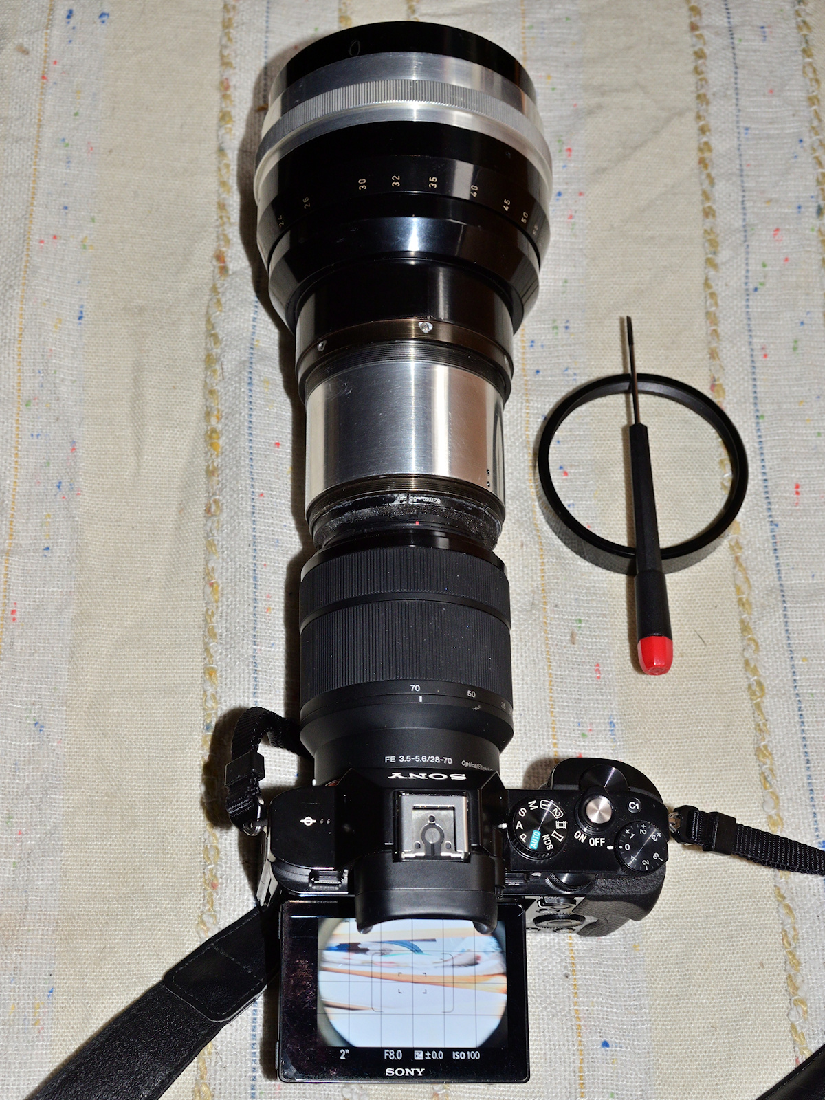 Heute habe ich das Objektiv mit einem mit FIX IT angeklebten Reduzierring auf 55 mm Frontfiltergewinde am 28-70er Zoom bei 70 mm und f/8 an meiner Sony A7 justiert:
