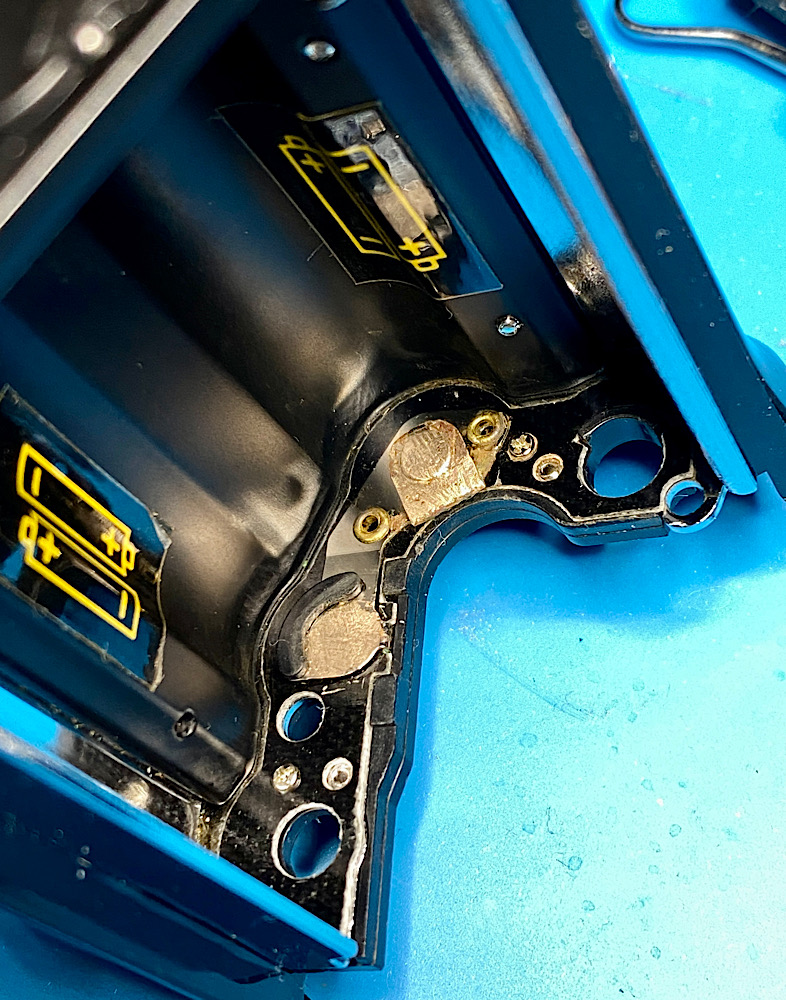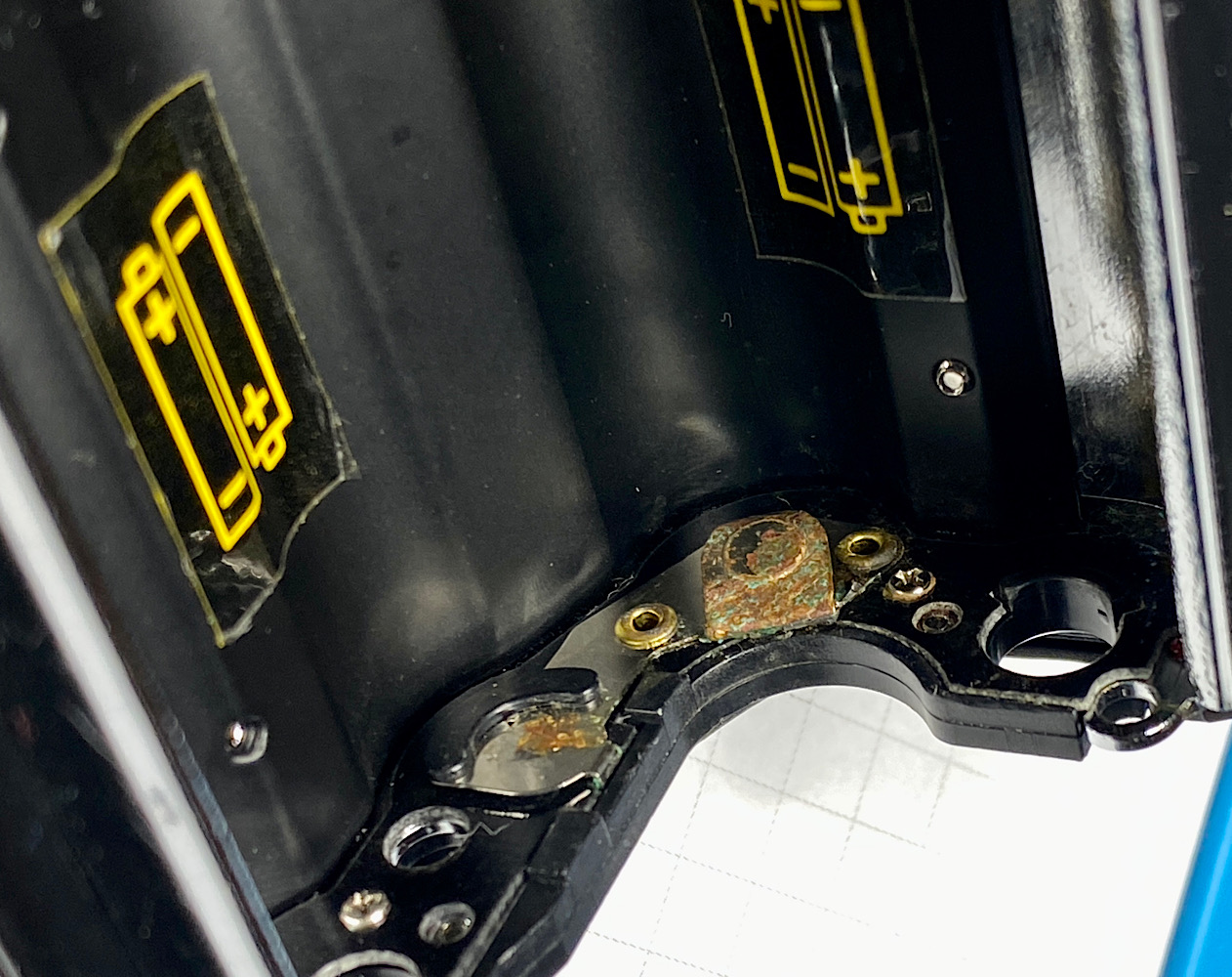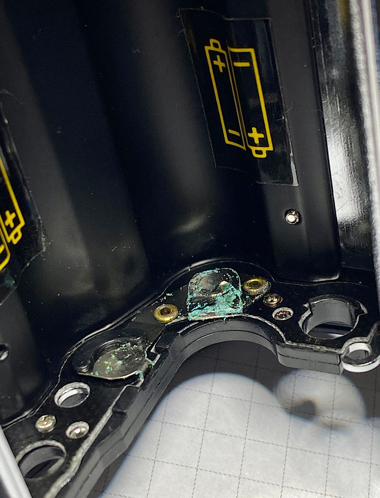 Korrosion hat sich auf Batteriekontakten und Kontaktspiralfedern ausgebreitet.