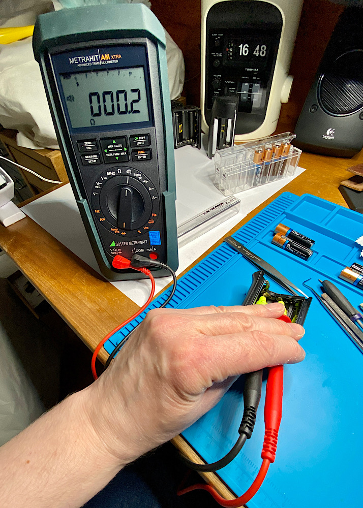 Ich prüfte nun die beiden verbundenen - und jetzt wiederhergestellten - Kontakte auf Durchgang.