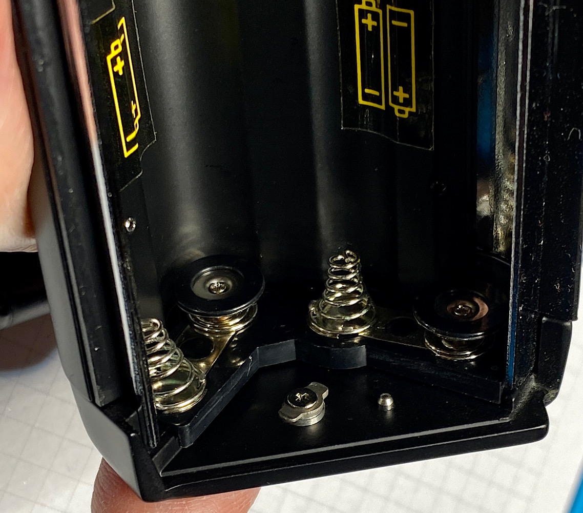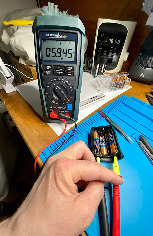 Jetzt noch vier AA-Batterien einlegen und die Spannung an den äußeren beiden Batteriekontakten prüfen: