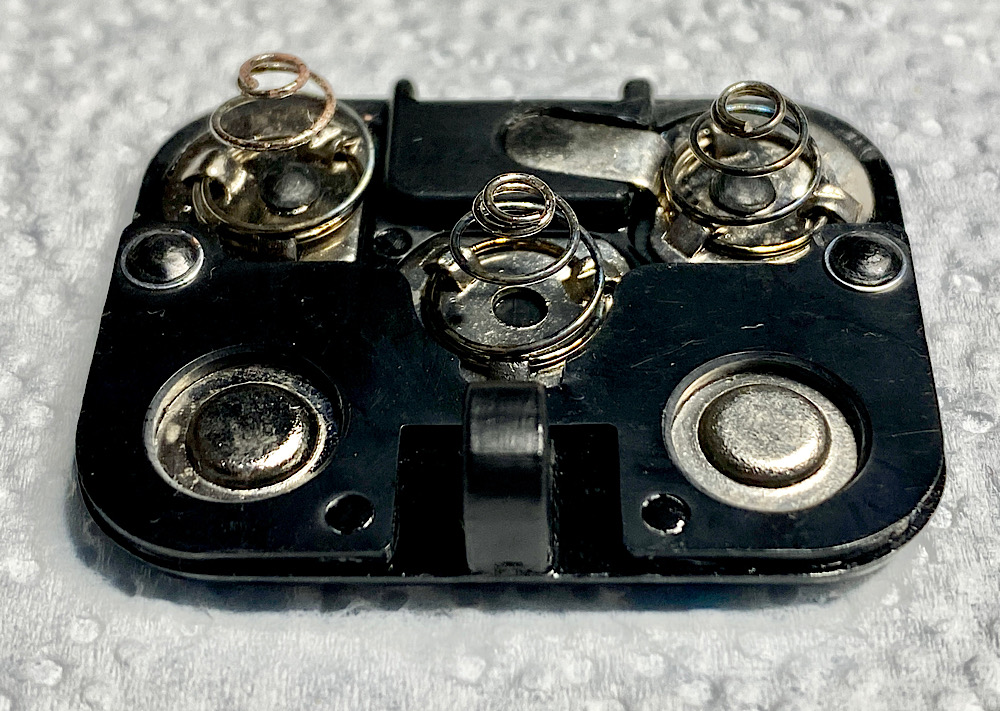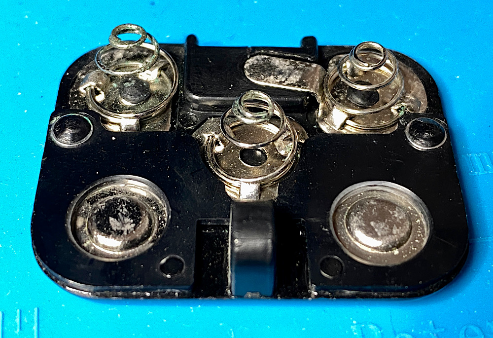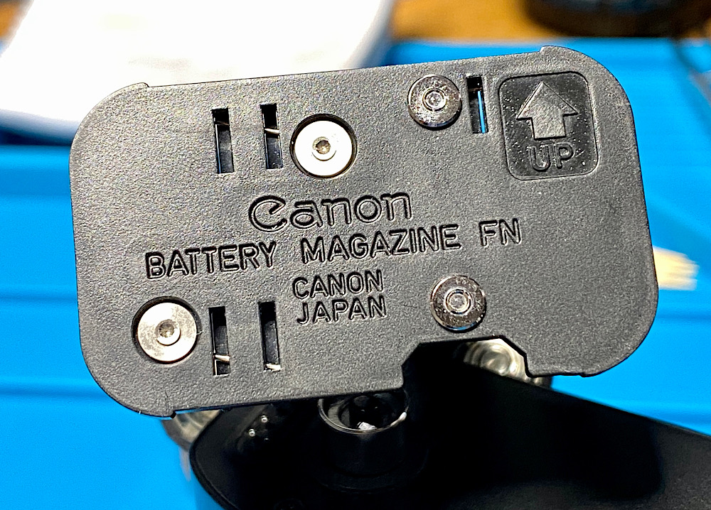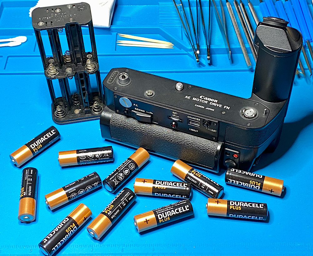 Ich hab grad die Kontakte im Batteriemagazin für den Canon AE Motor Drive FN von Korrosion befreit.