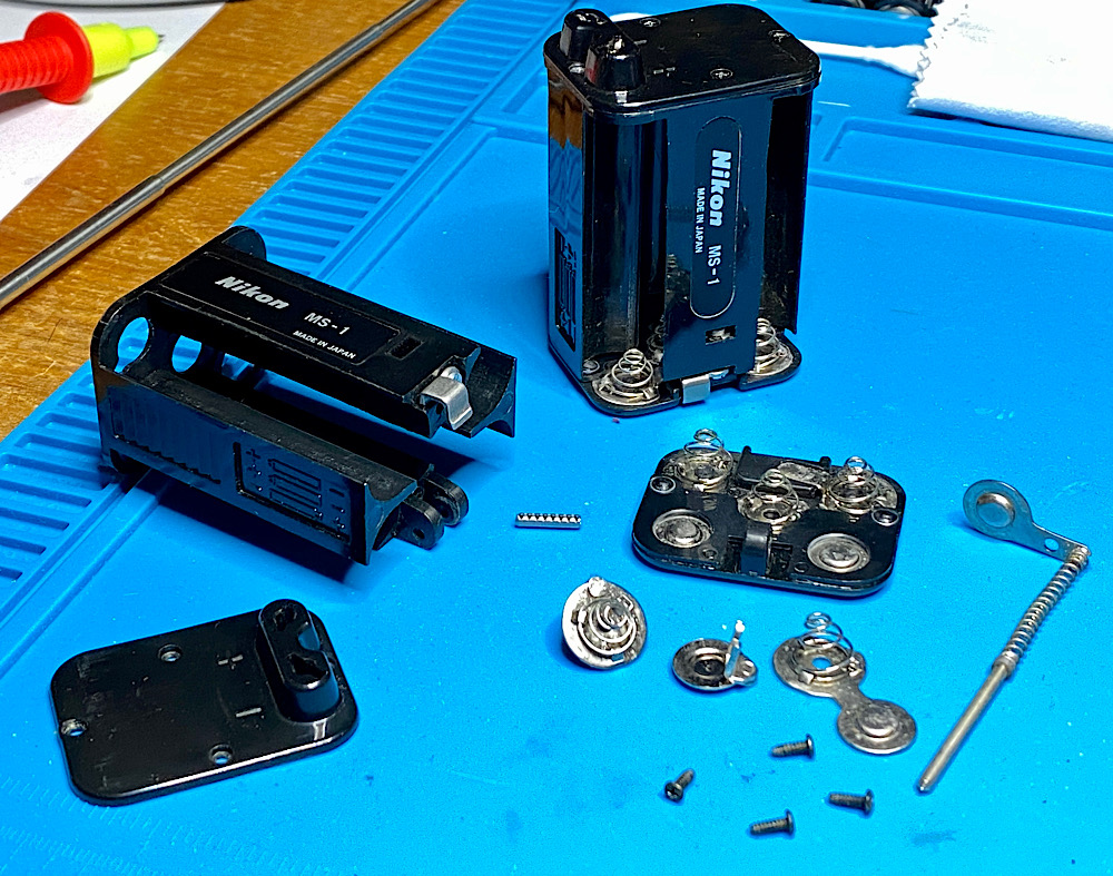 Hier, beim MS-1-Batteriekorb für den Motor Drive MD-3 zur Nikon F2, ist die Gefahr nicht so groß, sich in den einzelnen Bestandteilen zu verlieren. Aber es kommt doch einiges zusammen.