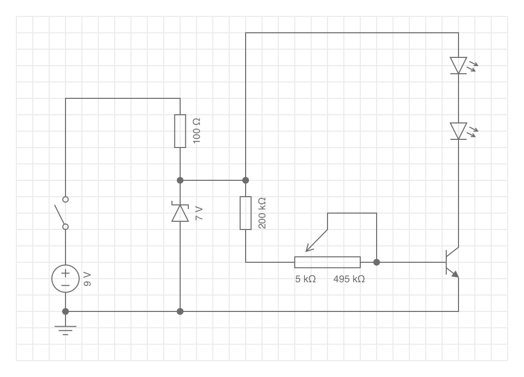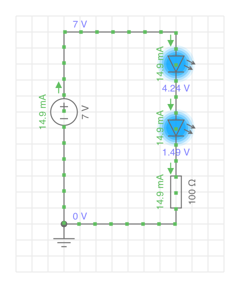 Also zur Sicherheit doch ein Vorwiderstand zur Strombegrenzung für die LED, bei der Annahme, dass die 7 V Betriebsspannung voll an den beiden LED abfallen bei Uce = 0 V (ideal voll durchgeschalteter Transistor, also kein Widerstand):