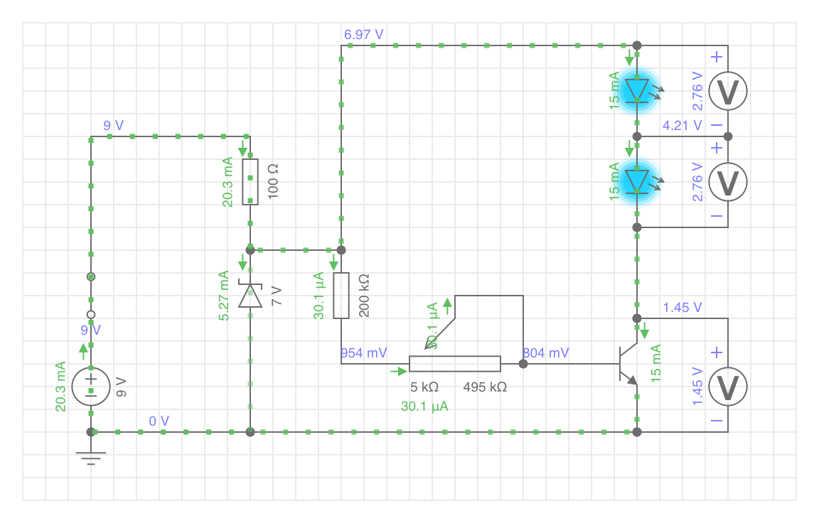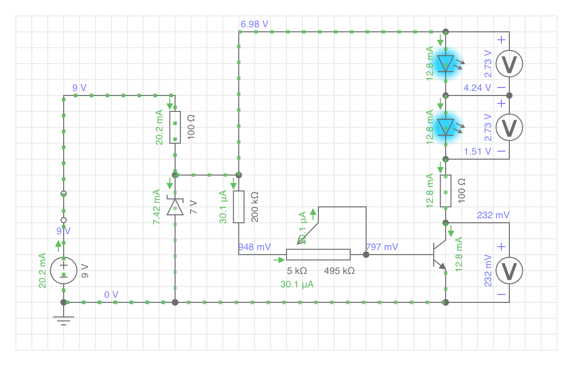 Vielleicht sollte ich mich nicht alleine auf die Kollektor-Emitter-Strecke des Transistors verlassen, die in der Simulation einen (LED)Strom begrenzenden Widerstand bildet.