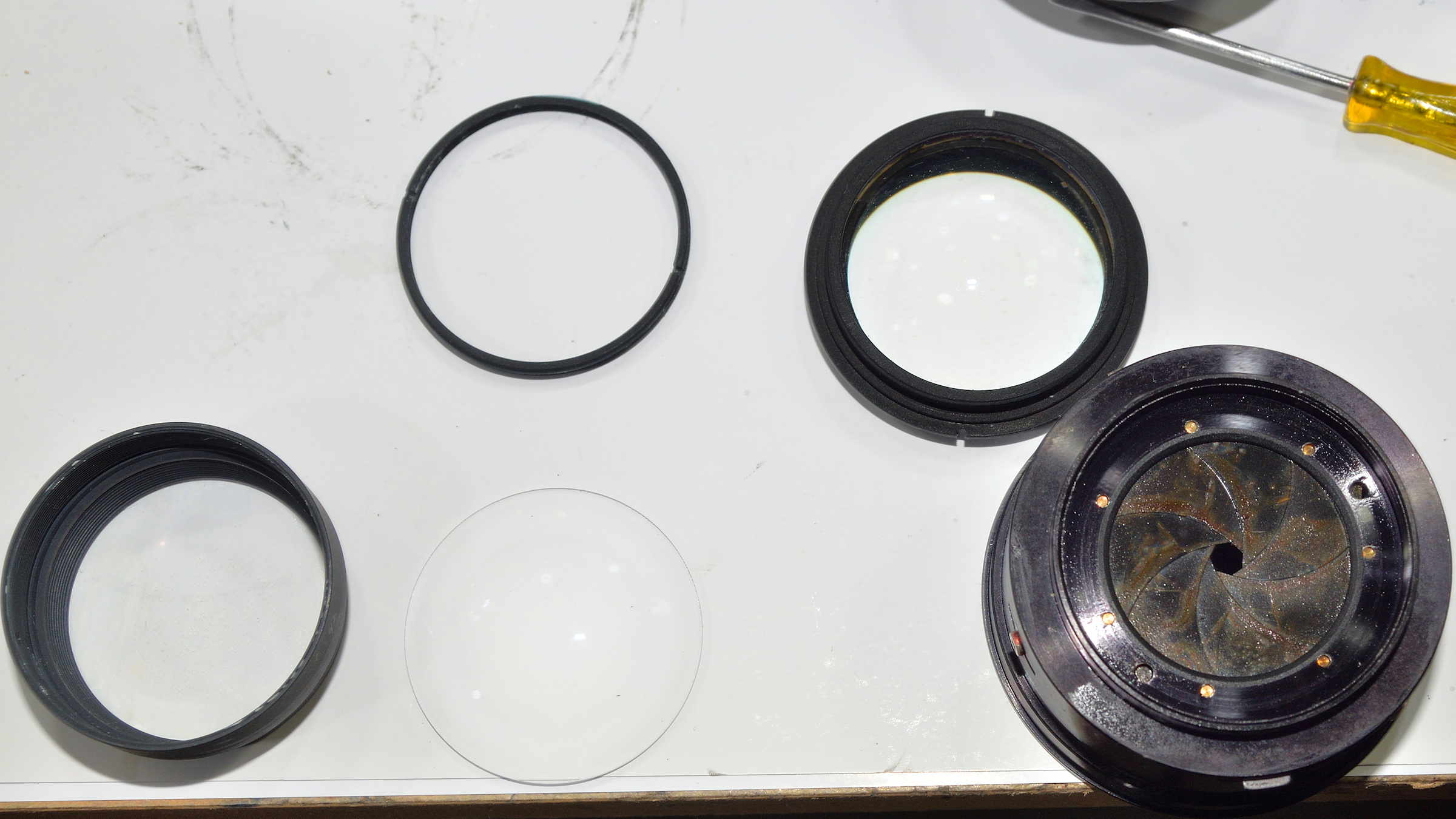 Bevor ich die gesplitterte Hinterlinse versuche, durch eine irgendwie passende zu ersetzen, habe ich mit diesem "sichtbar kaputten" Objektiv Testfotos gemacht.