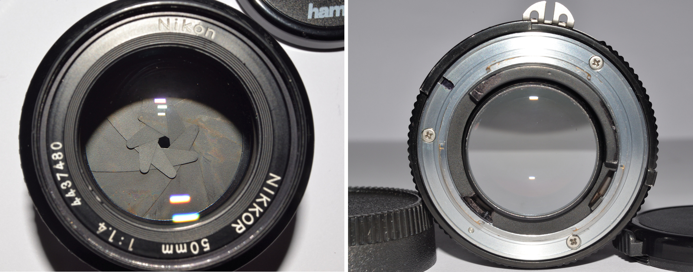Bei der Lieferung dieses Nikon 50/1.4 AI Nikkor war noch ein weiteres solches dabei, das keine Pilz- oder Wasser-Schäden zeigte, dessen Hinterlinse aber gesplittert ist.