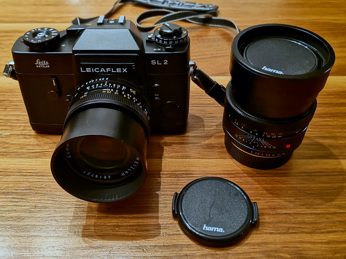 Damals hatte ich meinen Bankberater einen guten Mann sein lassen und mir ein manuelles, analoges Schmuckstück mit edlen Linsen geleistet. Eine vollmechanische Leicaflex SL 2, die Leitz zwischen 1974 und 1976 hergestellt hat. Dazu ein Leitz Wetzlar Summicron-R 1:2/35mm von 1977 mit eingebauter einteiliger Streulichtblende und ein Leitz Canada Summicron-R 1:2/90mm von 1976 mit eingebauter zweiteiliger Streulichtblende. Beide von Walter Mandler gerechnet.