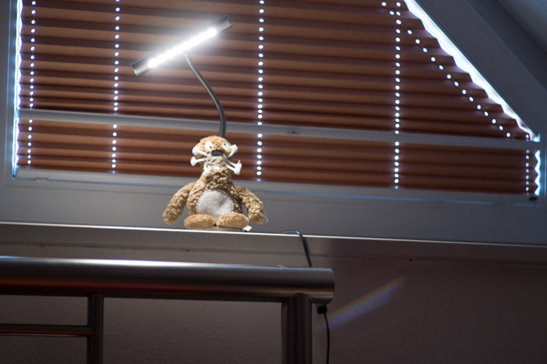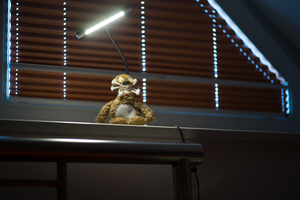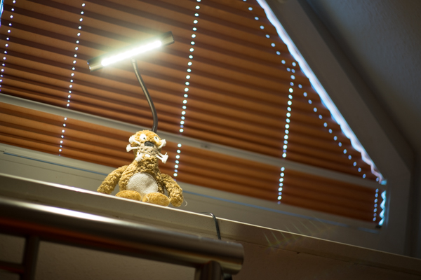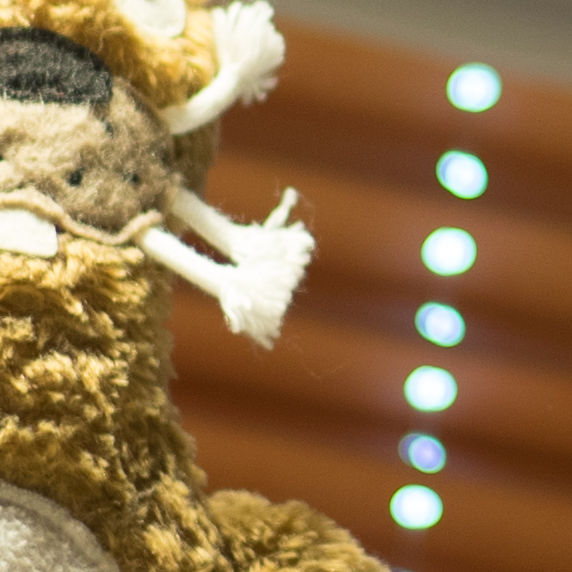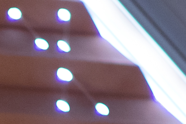 Jetzt habe ich versucht mit Hilfe der Entfernung ein vergleichbares Bild zu erzeugen (Sony 2m / Canon etwas mehr als 3m) - der Focus ist auf dem Schalter um mehr CAs zu provozieren; meine Canon wählte ISO 200, während die Sony beharrlich mit ISO 100 ausreichend Licht einfängt. Anpassungen in Lightroom = Wolframlicht und automatische Belichtungskorrektur (welche auch die Schwarztöne verstärkt) - der Crop zeigt die Löcher des Plissee Oben Rechts "Kreuzung" am Rahmenrand.