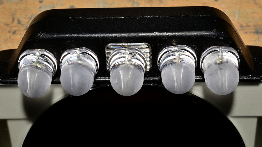 So habe ich diese Lämpchen ausgebaut, deren Spannungsversorgung und Stromaufnahme gemessen (4 Volt 125mA) und mir statt desen 5 LEDs mit 140 cd bei 3,2 V 30 mA besorgt, diese statt dessen eingebaut und mit 800er Schleifpapier mattiert, da sie im klaren Zustand nur 20° Öffnungswinkel haben.