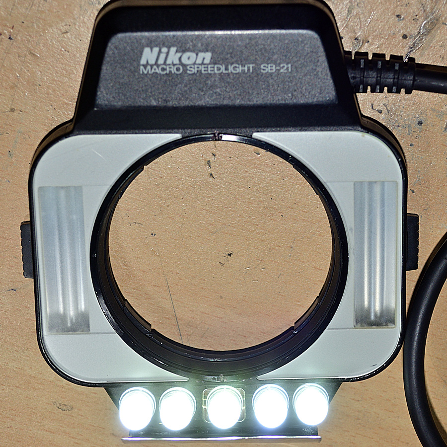 Die 5 LEDs laufen mit 3,2 Volt und zusammen 150 mA und bringen dabei 700 cd - das reicht sogar für Makro-Videos...