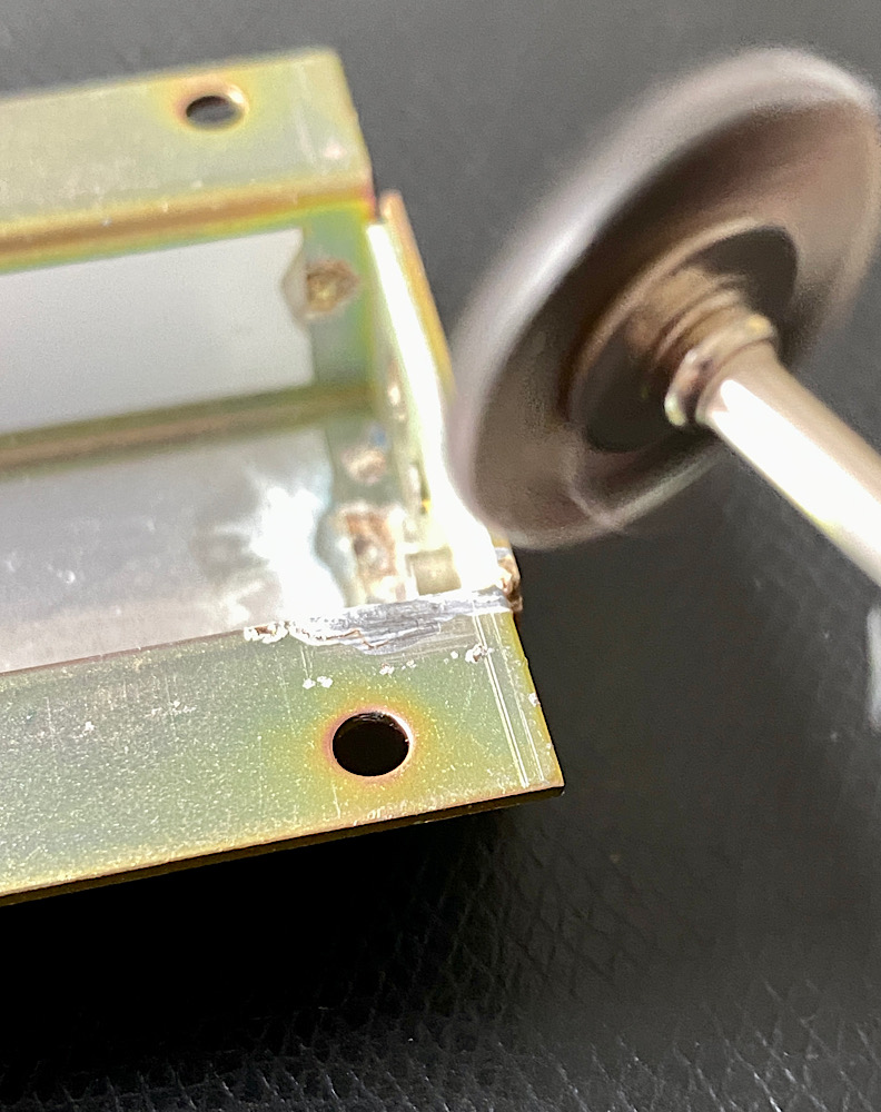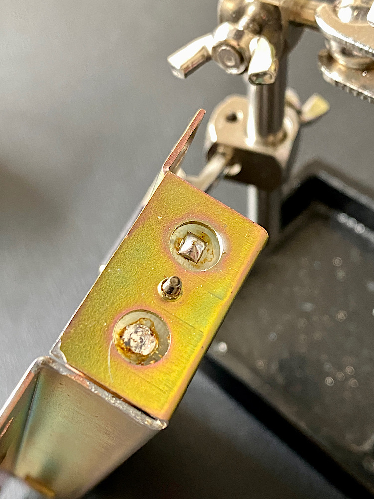 Kontaktfeder Nr. 1 ist ausgelötet und erhält Gesellschaft von einem Tropfen Lot: