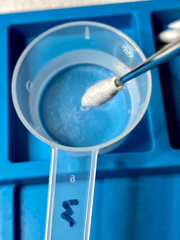 Ich versuche die Reinigung mit einem mit Wasser angefeuchteten Wattestäbchen.