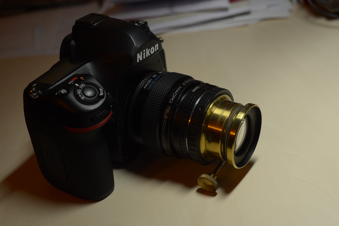 Die Adaption an Nikon F erfolgt über einen Adapter M48x0,75 auf Nikon F, einen 13mm Zwischenring und als Fokussierhelicoid einem Soligor C/D7 Macro Telekonverter, bei dem ich die Linsen entnommen habe (es ist irgendwie völlig unmöglich, anders einen Helicoid-Makrozwischenring für Nikon F zu einem vernünftigen Preis zu bekommen). Der Adapter M48x0,75 passt eigentlich nicht, weil er die Fokussierung Objektivs behindert und den Fokussierbereich noch mal auf die Hälfte einschränkt. Da man aber ohnehin einen Fokussierhelicoid braucht, um das Objektiv sinnvoll nutzen zu können, fällt das in der Praxis nicht ins Gewicht.