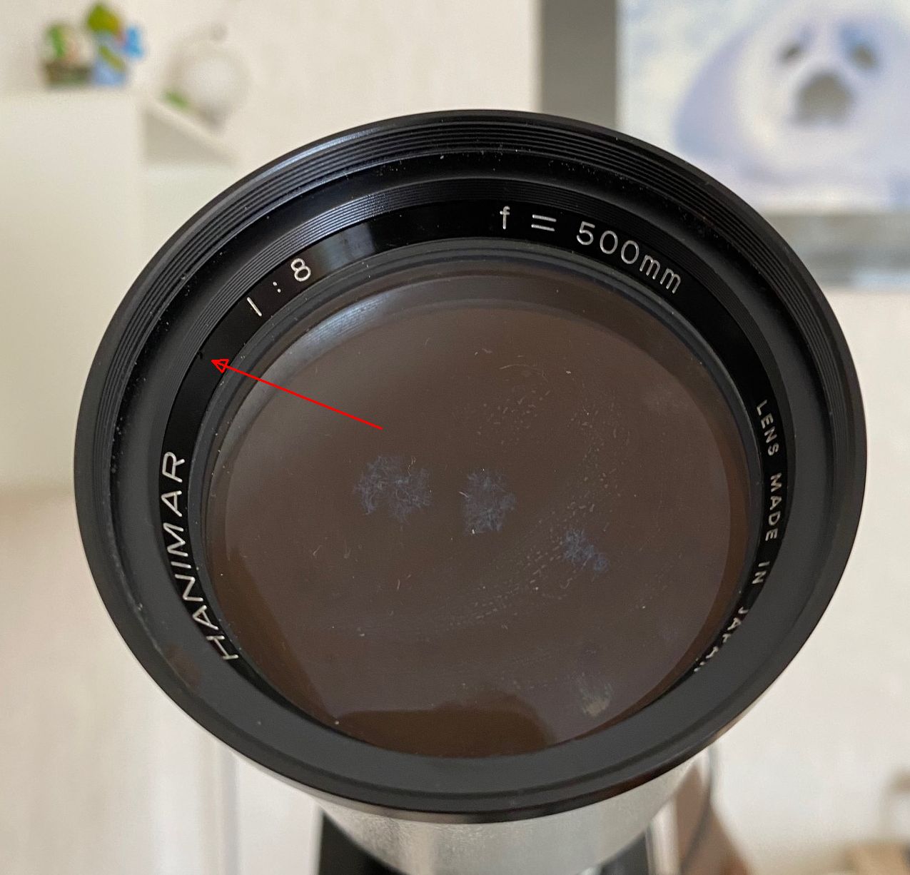 wenn ich das richtig sehe, ist dort wo der rote Pfeil hinzeigt eine der Kerben vom Frontring, an der man zum Lösen desgleichen mit geeignetem Werkzeug ansetzen kann: