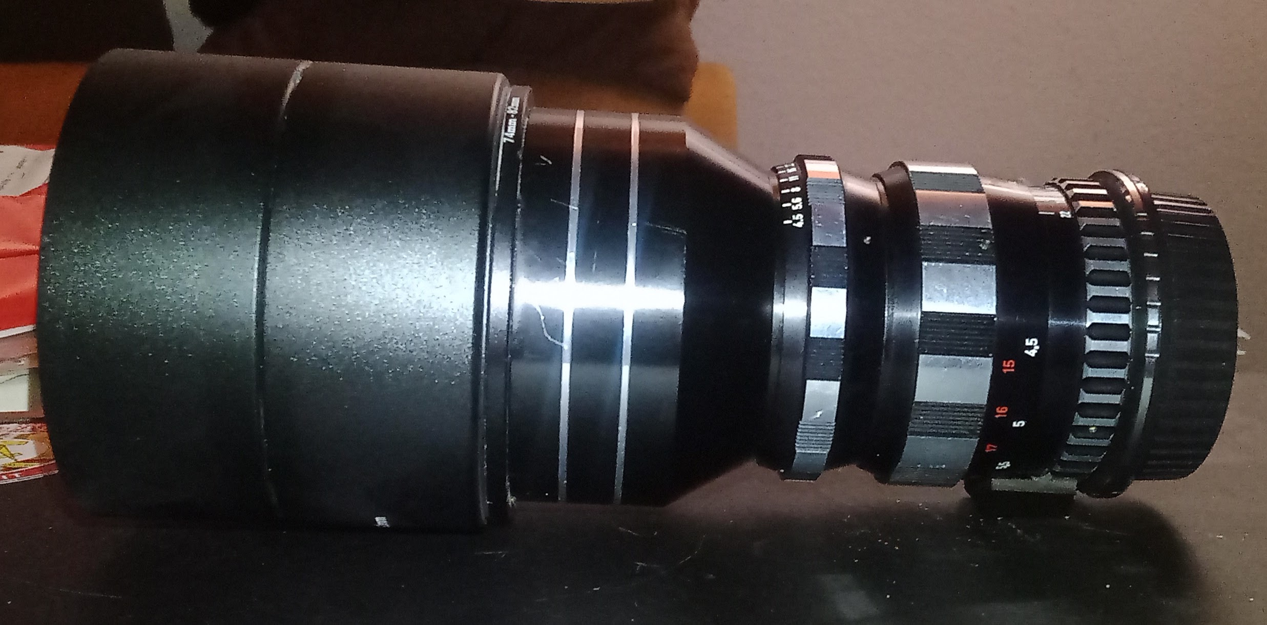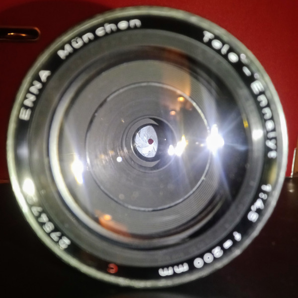 Ein kleiner, aber schwerer Brocken, und relativ selten: Das Enna Tele-Ennalyt 4,5/200mm. Rastblende, einfache Schneckenfokussierung, E74 Frontgewinde.