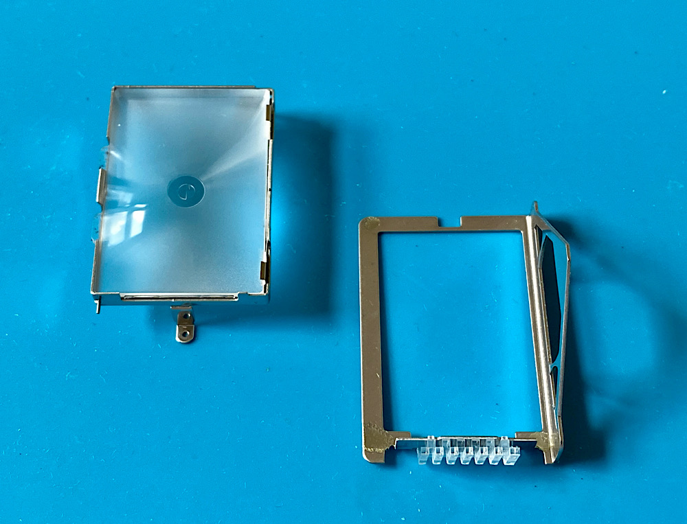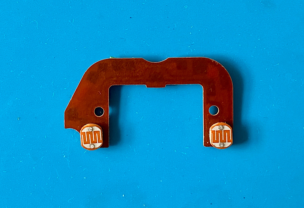 Die beiden CdS-Fotowiderstände, auf der Innenseite einst links und rechts vom Okular angeordnet.