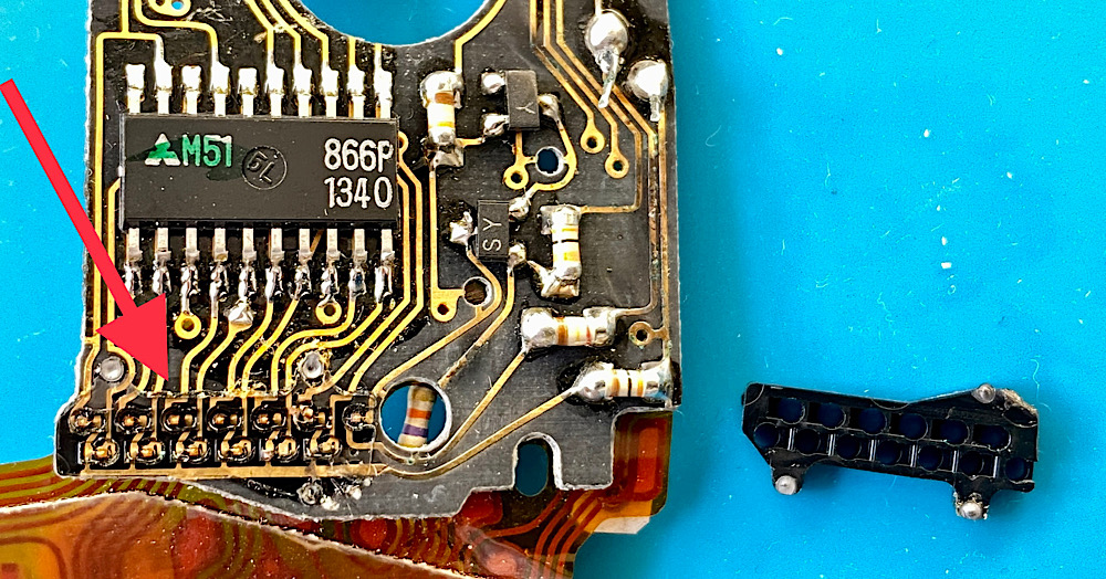 Hier - direkt auf der Unterseite der Platine - sollten die LEDs sein, die in Reihe neben der Verschlusszeitenskala im Sucher leuchten.
