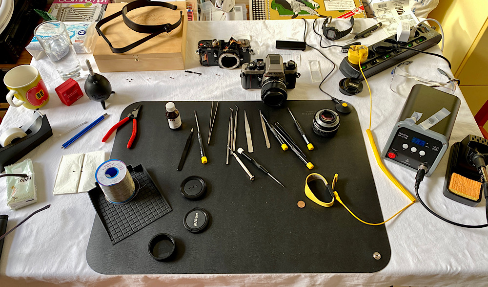 Meine mobile Werkstatt - heute ESD-mäßig eingerichtet, um die Schaltungen der beiden F3 vor elektrostatischen Entladungen zu schützen: