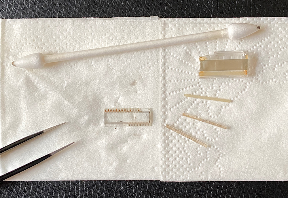 Bevor ich das LCD einbaute, reinigte ich die beiden Kontaktreihen auf der flexiblen Platine mit Isopropylalkohol.