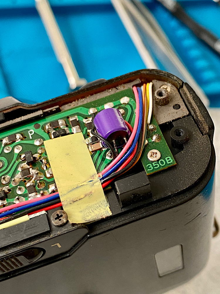 Über dem Batteriefach sitzt ein violetter Elko, vielleicht schon seit 1986.