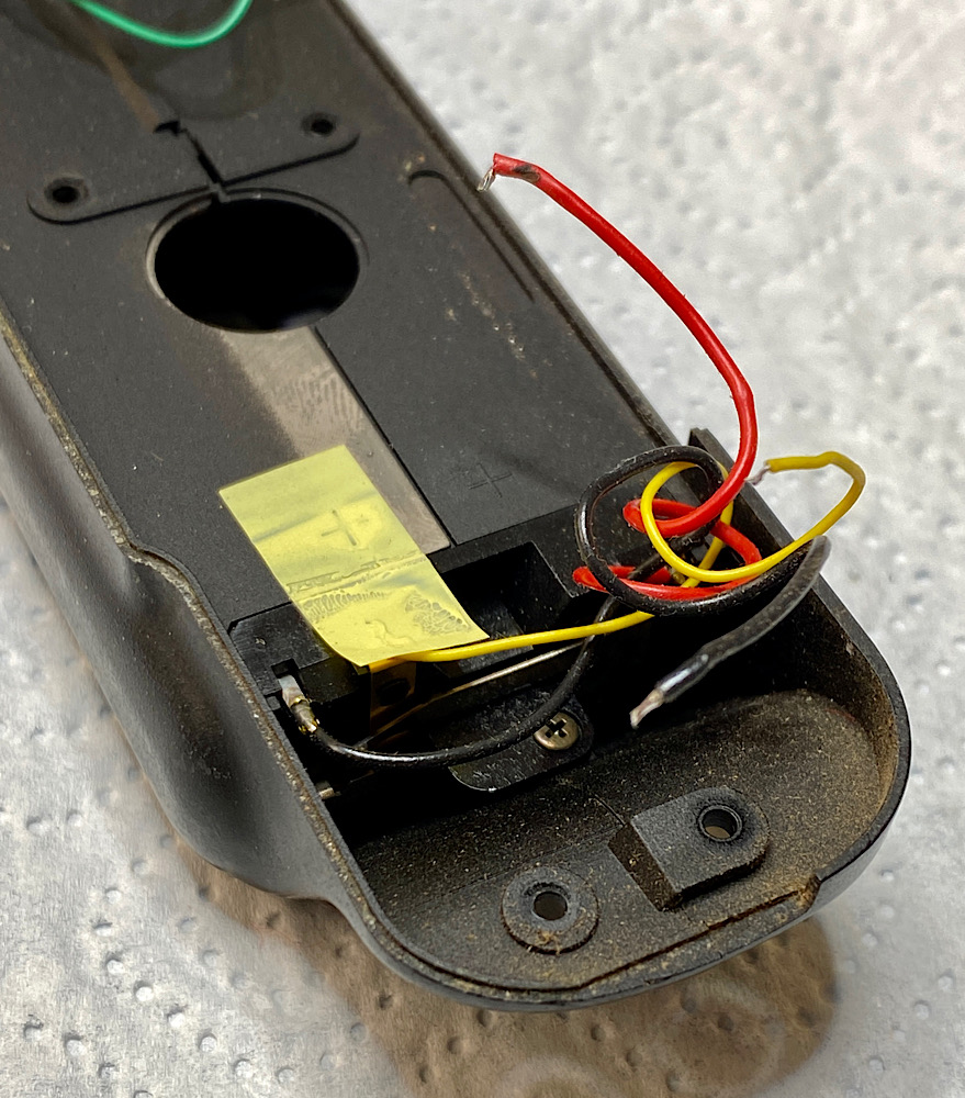 Der Bereich hinter dem Batteriefach mit Kontaktplatte und Verkabelung.
