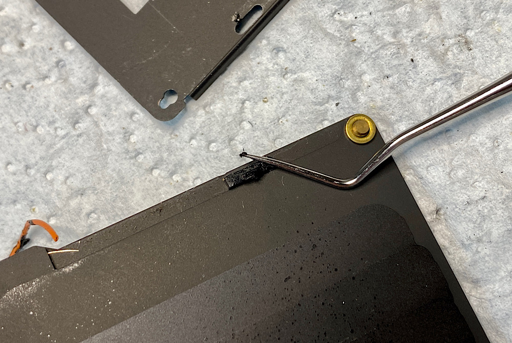 Bei Korrosion würde die Kontaktplatte mit der Zeit von der Batteriesäure angegriffen werden und eines Tages ausfallen. Vermutlich würde sich die Korrosion auch weiter auf den Teil der flexiblen Platine darüber ausbreiten, aber es scheint hier einiger Zwischenraum zu sein.